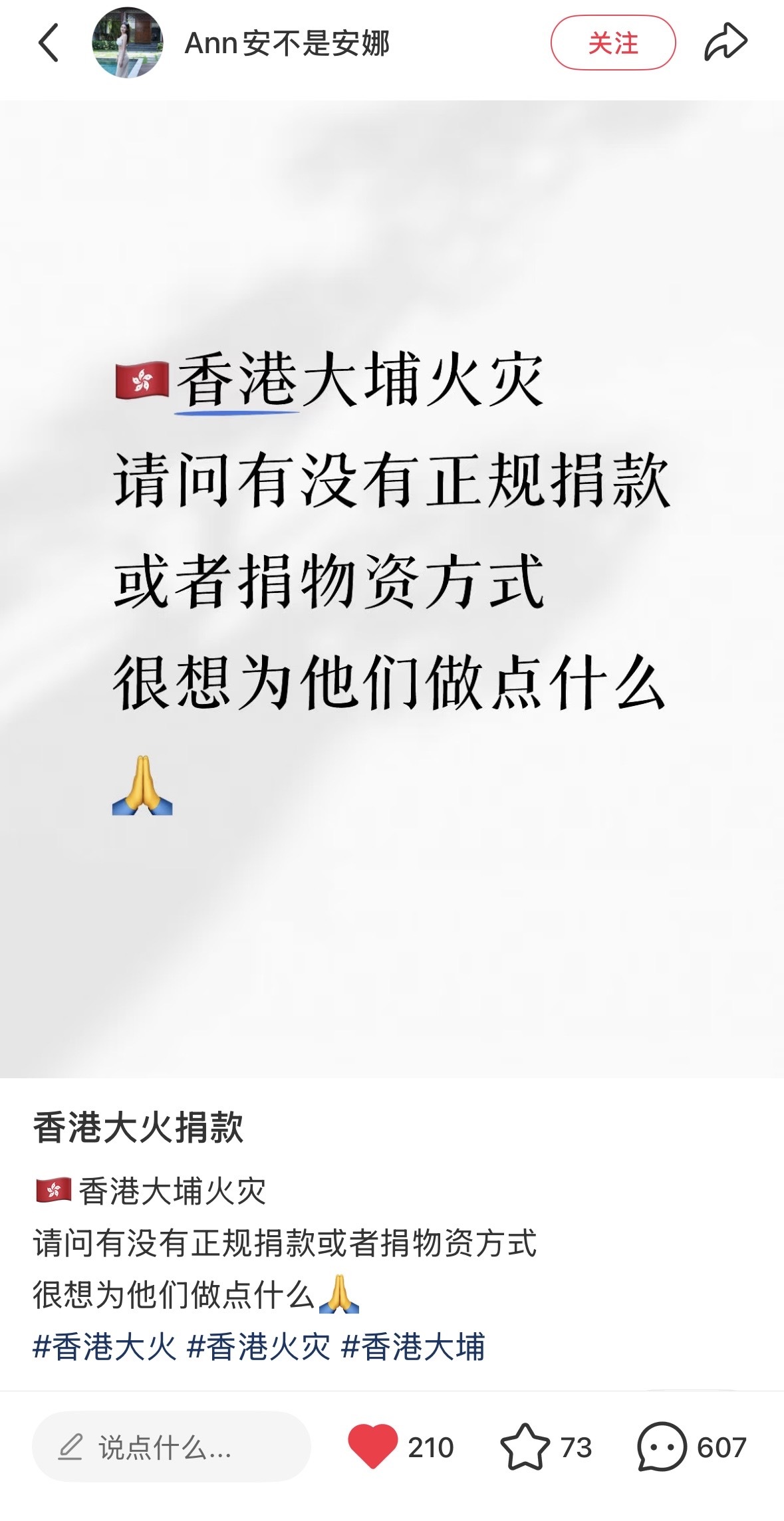 【點新聞報道】「尋找給香港捐款的官方渠道,很想為他們做點什麼」「我想為香港捐款,可以怎麼做?」「有香港同胞嗎?你們現在最缺什麼?」香港大埔宏福苑發生五級大火的消息,連日來持續牽動着內地民眾的心,各類飽含牽掛的聲援帖文,在內地社交網絡上不斷湧現。災情發生後,內地網友的愛心迅速凝聚,大家紛紛主動探尋捐贈渠道,用實際行動支援香港。