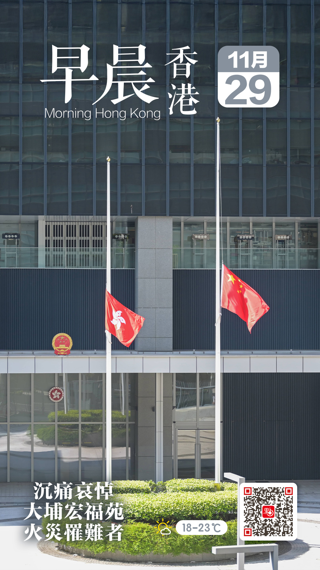 由今日起至12月1日,全港所有政府建築物及設施(包括特區政府駐境外辦事處)的國旗及區旗會下半旗誌哀。其間,政府主要官員會取消非必要的公開活動。所有由政府舉辦及資助舉行的娛樂及慶祝活動亦會按情況安排取消或延期。