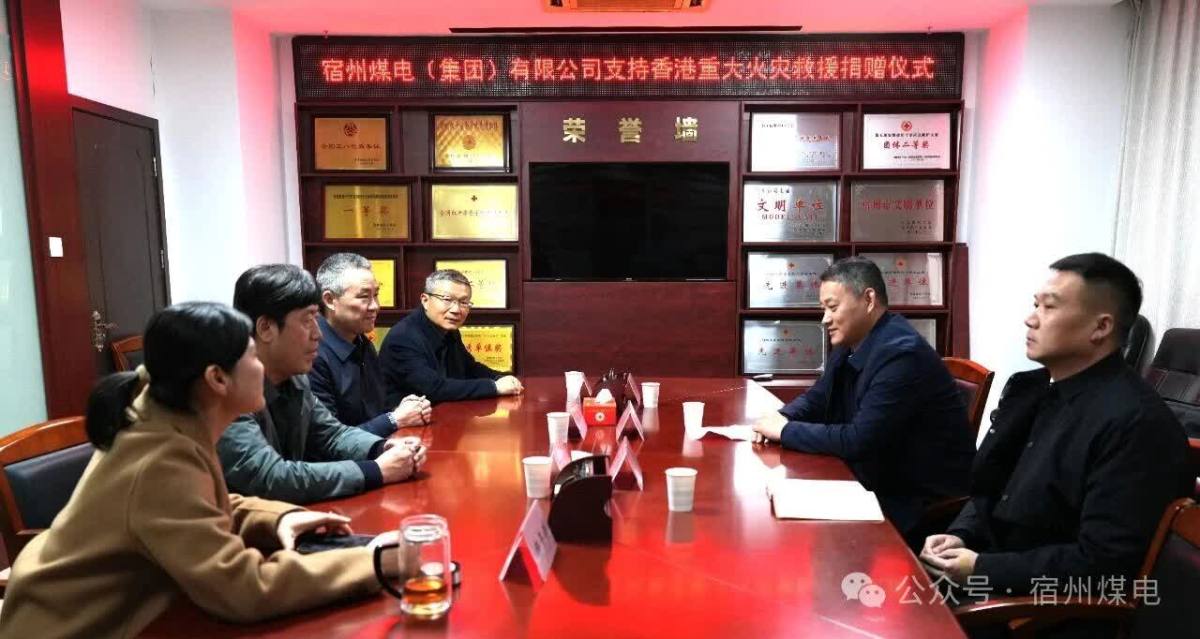 11月28日,捐助款通過中國紅十字會總會迅速到達香港災區。宿州市紅十字會為集團公司舉行了捐贈儀式,宿州煤電黨委副書記房孝虎受李士傑董事長委託,代表宿州煤電全體員工向香港大埔區宏福苑受火災的同胞們捐贈100萬元人民幣。他表示:「香港與內地血脈相連,同胞有難,我們責無旁貸。」他續說,宿州煤電作為宿州市的優秀民營企業代表,始終秉持財富「取之社會、用之社會」的理念,在企業發展的同時,從未忘記社會責任,積極投身公益慈善事業,以實際行動詮釋着企業的擔當與愛心。希望通過捐款,在香港特區政府和社會各界的共同努力下,受災同胞一定能早日渡過難關、重建家園。