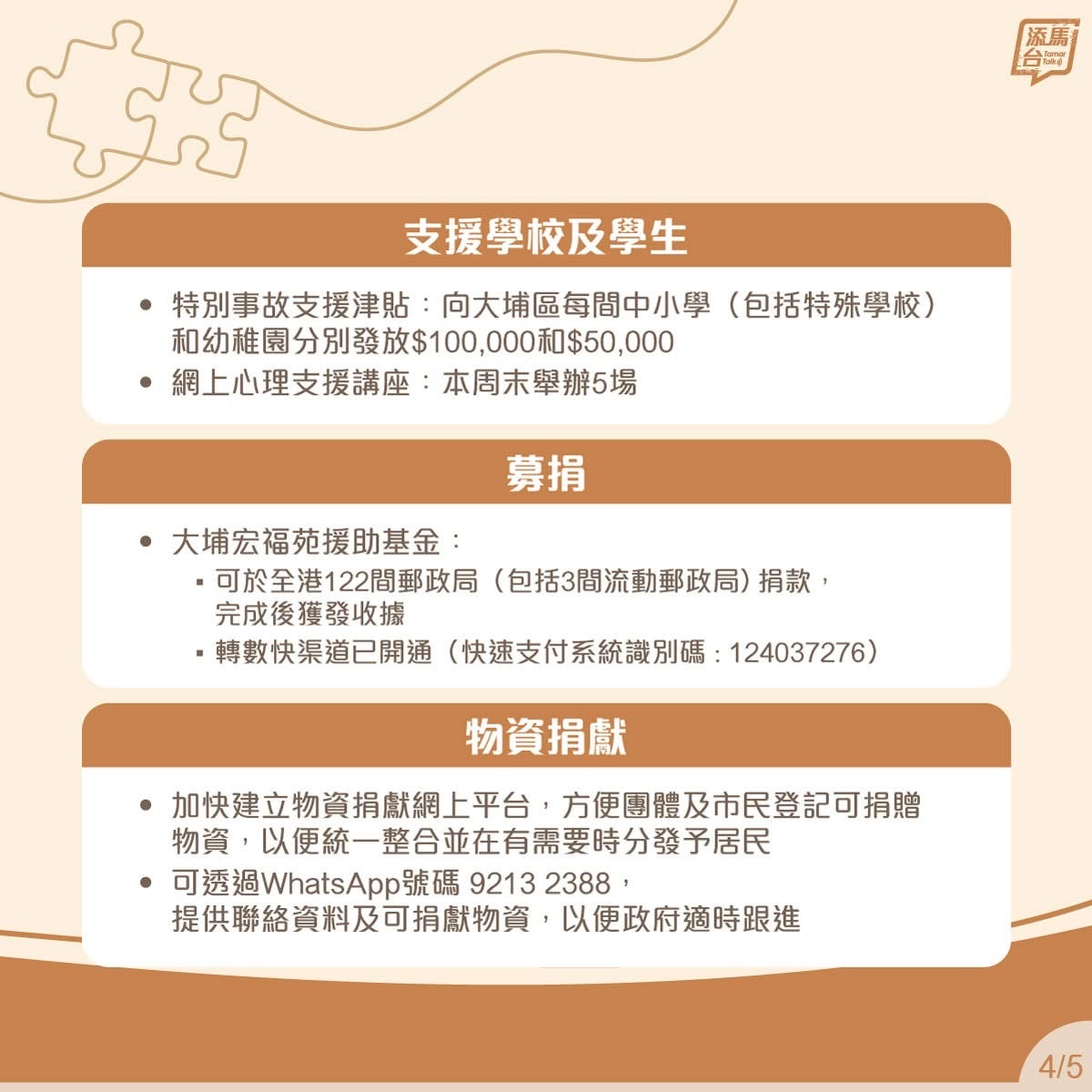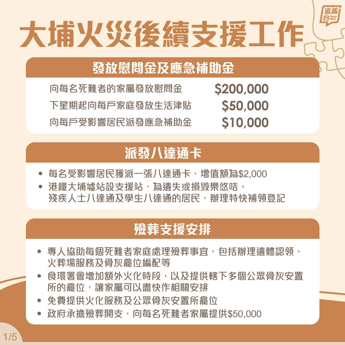 後續工作從多方面支援受影響居民,政府亦已設立「大埔宏福苑支援服務」專題網站,一站式提供住宿支援、物資援助、政府專項基金、經濟援助,以及醫療與心理支援等相關資訊及最新消息,方便市民查閱。