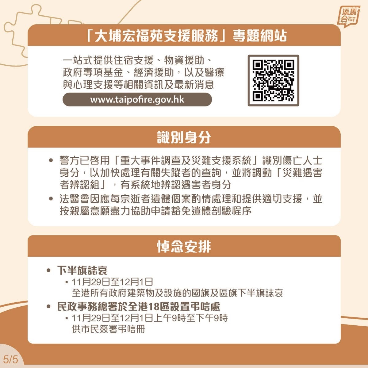 為表達對大埔宏福苑火災罹難者的沉重哀悼,全港所有政府建築物及設施的國旗及區旗於11月29日至12月1日下半旗誌哀。在哀悼期間,民政事務總署會於全港18區設置弔唁處,供市民簽署弔唁冊。