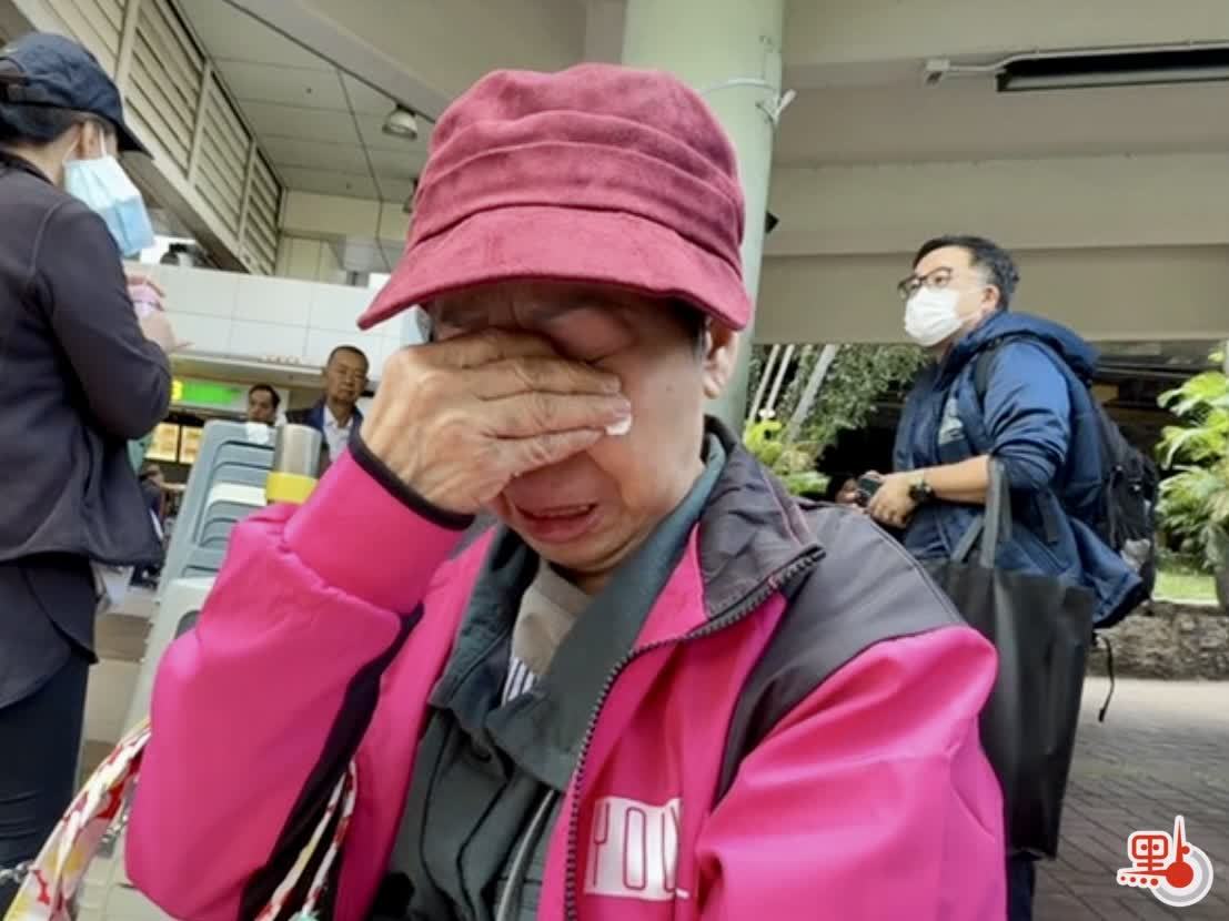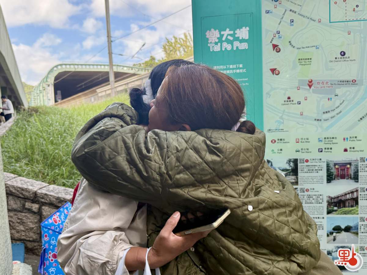 在大埔墟臨時物資站的一處,傭工Mariz與另一位同樣來自宏泰閣的傭工相擁而泣,「我們還活着(We still alive)」,她激動地說。