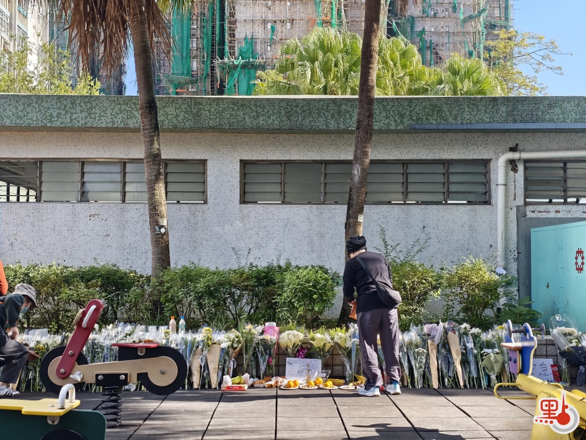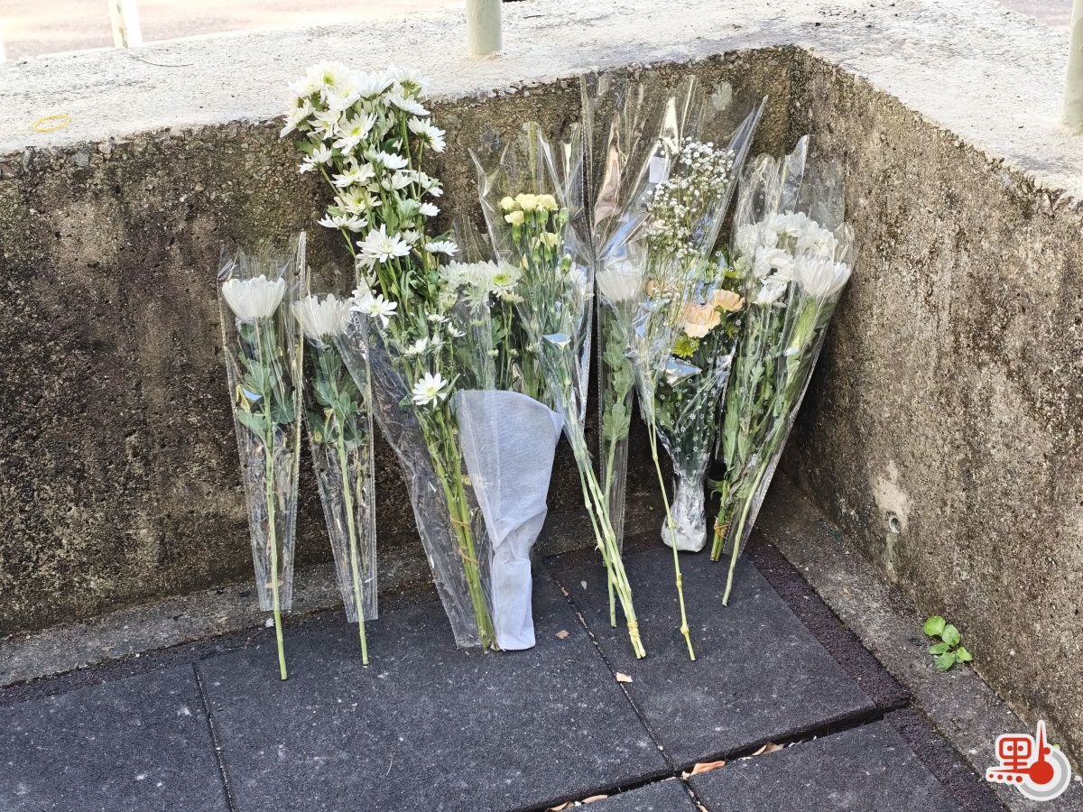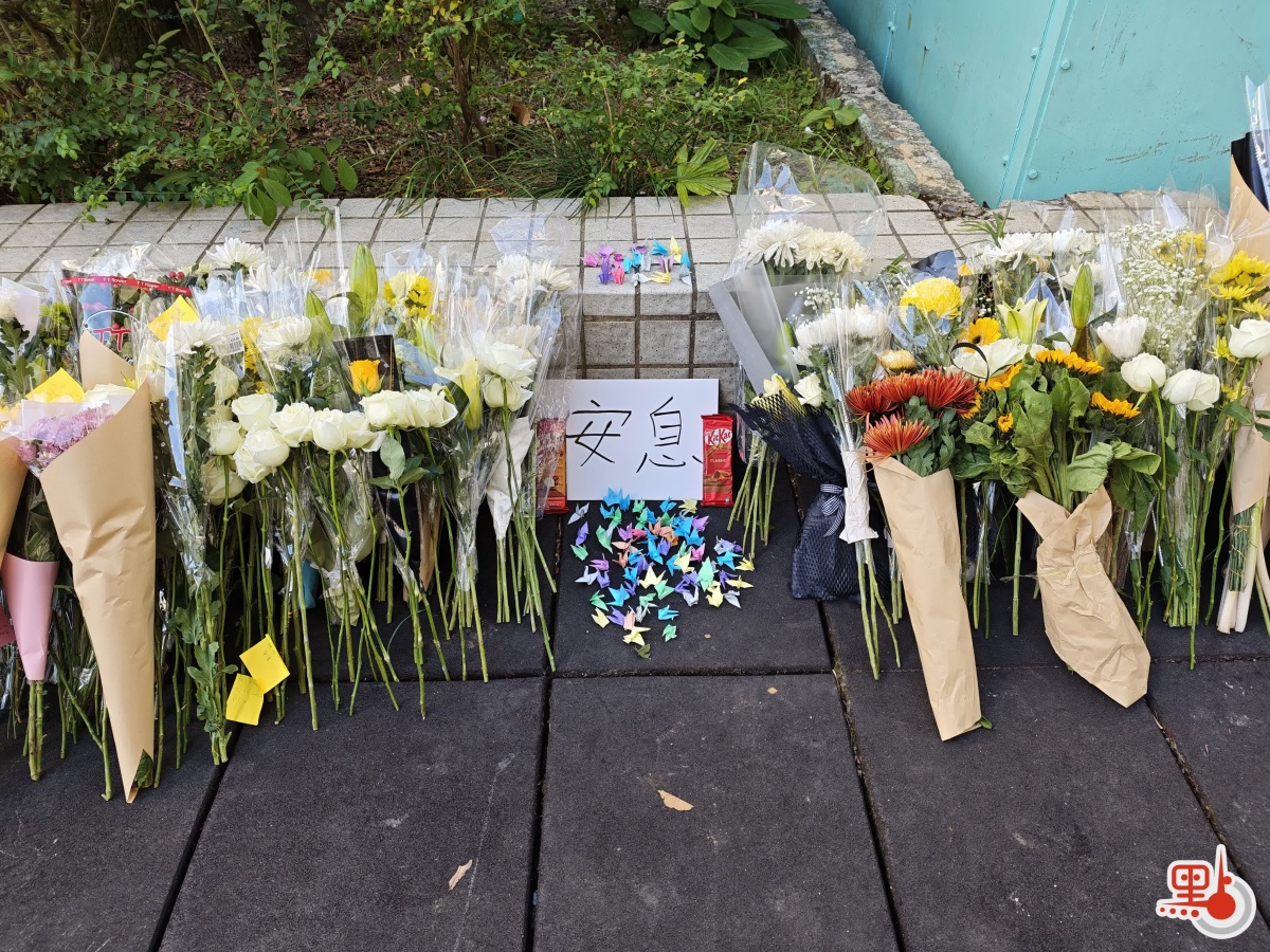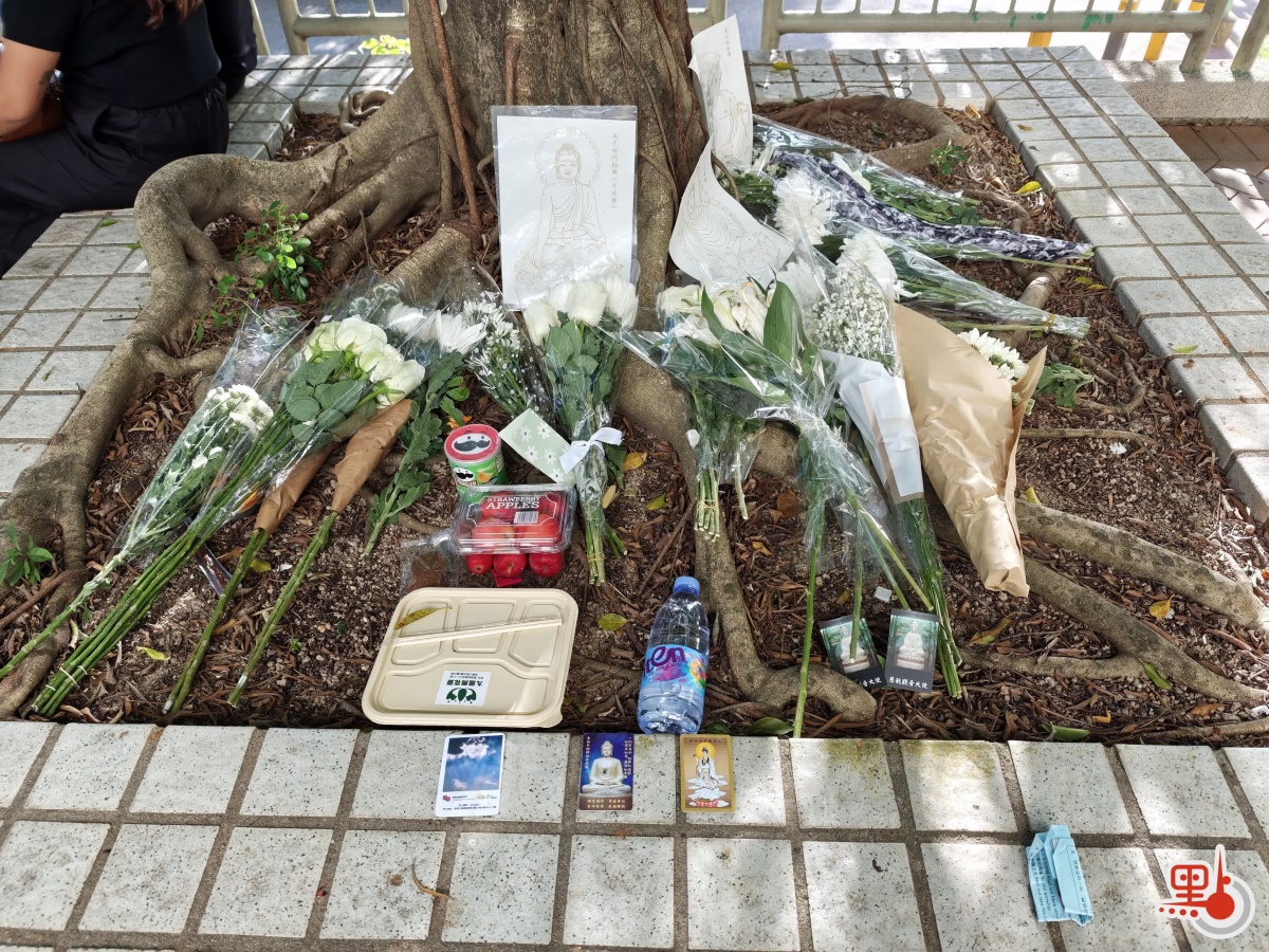 在大埔馮梁結紀念中學附近,不少市民自發向宏福苑方向獻花。(點新聞記者劉鴻霖攝)