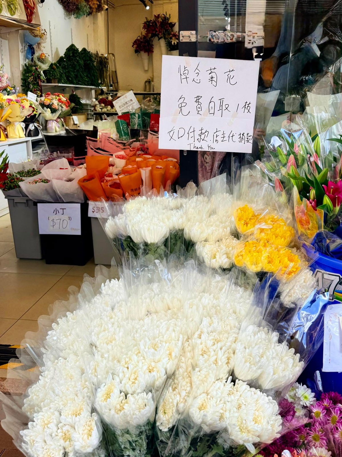 熱心花店老闆,提供免費悼念菊花。(FB群組將軍澳主場)