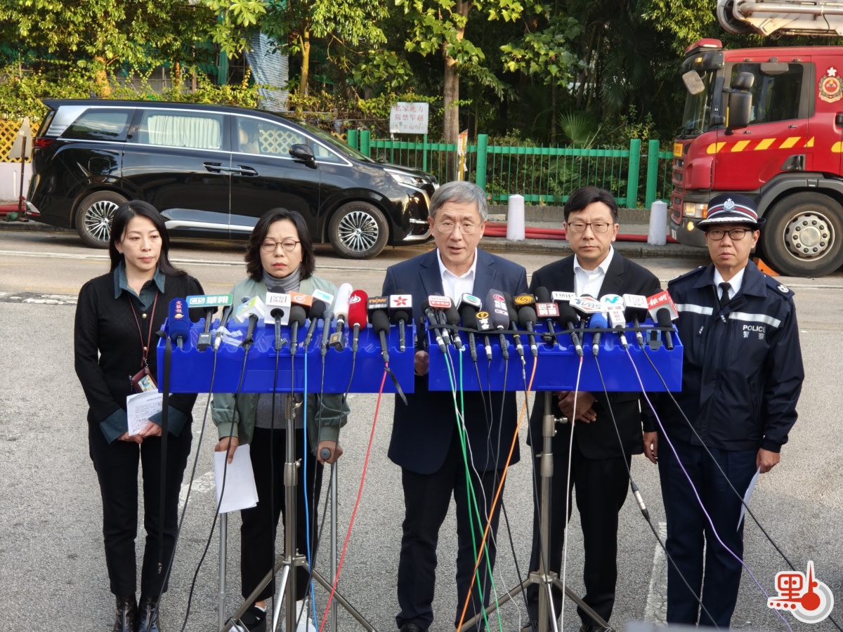 【點新聞報道】大埔宏福苑11月26日下午發生五級大火,造成多人死傷。今日(29日)下午,政務司副司長卓永興、民政及青年事務局局長麥美娟、勞工及福利局局長孫玉菡、警務處新界北總區指揮官助理處長林敏嫻、警務處傷亡查詢中心主管總警司曾淑賢等政府官員,在宏福苑火警現場視察,向相關人員了解情況後見記者。