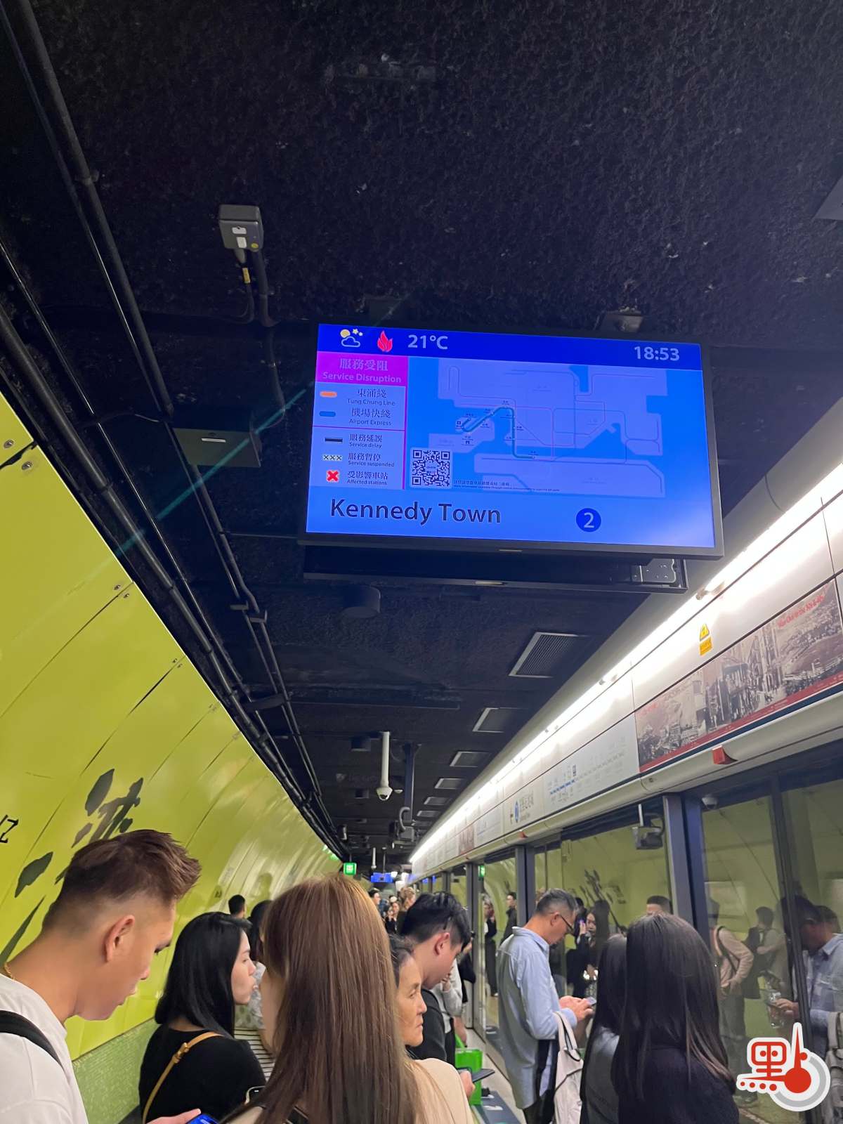 晚上18時54分,點新聞記者在堅尼地城站的月台顯示屏上看到,東涌綫及機場快綫皆顯示「交通受阻」,暫未恢復正常。