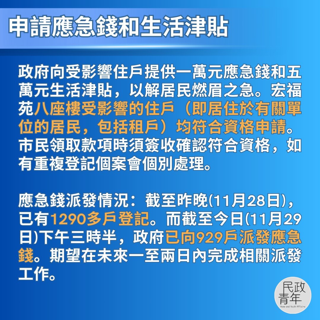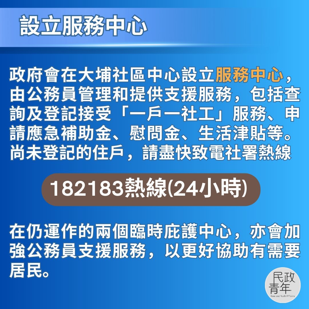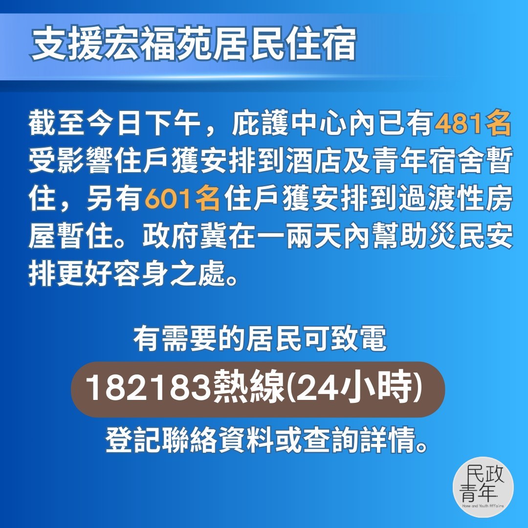 民政及青年事務局在社交平台發文表示,目前政府為所有受影響住戶提供所需的福利服務及其他支援(包括經濟援助),均會透過「一戶一社工」,並由專屬社工為居民跟進,居民不用四處奔走及處理各種填表事宜。社工亦會為居民提供支援住宿安排,所有短期或長期住宿安排均屬「免費」。未與社署聯絡的居民,請盡快致電社署24小時熱線182183登記。
