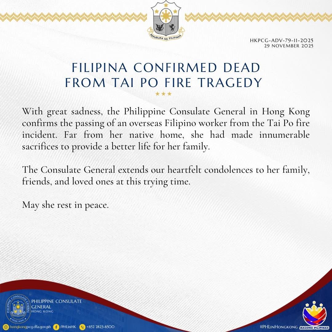 【點新聞報道】大埔宏福苑11月26日下午發生五級大火,造成嚴重死傷。菲律賓駐港總領事館昨日(29日)發稿確認,一名菲傭在火災中離世,領事館表示在此艱難時刻向她的家人、朋友及親人表示衷心慰問,讚揚她遠離家鄉做出無數犧牲,為家人帶來更好生活,願死者安息。