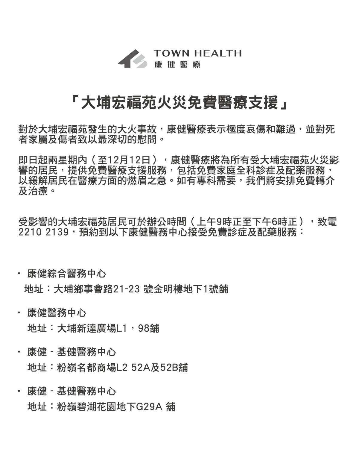 受影響的大埔宏福苑居民可於辦公時間(上午9時正至下午6時正),致電2210 2139聯絡康健醫療客戶服務團隊,預約到指定康健醫務中心接受免費診症及配藥服務。如有專科需要,康健醫療將安排免費轉介及治療。