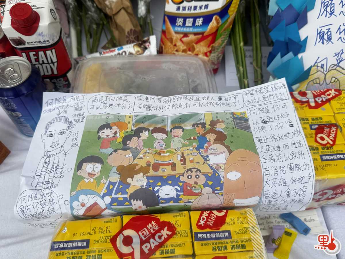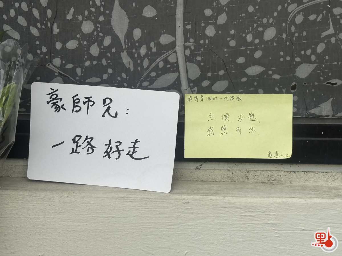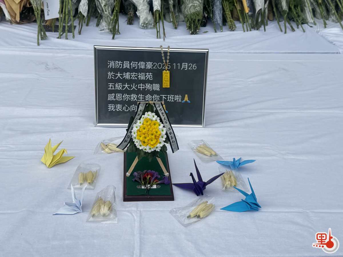 何偉豪生前在沙田區消防總局駐守。上午10時後,沙田區消防總局外設置悼念台,台上擺放紀念牌,上書「消防員何偉豪2025年11月26(日)於大埔宏福苑五級大火中殉職,感恩你救生命,你下班啦,我衷心向你致敬。」紀念牌前陳設小花圈,後方台上鮮花層層疊疊,夾雜着市民手寫的感謝卡與祈福紙鶴。感謝卡上有來自同事的悼念——「豪師兄,一路好走!」亦有小朋友創作的消防員形象插畫,搭配送來的檸檬茶,寫上「檸檬茶請沙田消防員飲!」