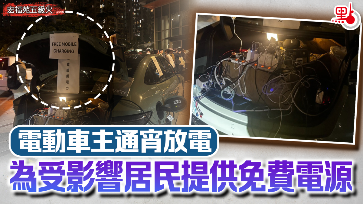【點新聞報道】11月26日大埔宏福苑發生五級火警,造成重大傷亡。災後有許多市民自發前往支援受影響居民,其中有3名比亞迪電動私家車車主於28日早上,驅車前往大埔東昌街社區會堂外,利用車輛放電功能,免費為受影響居民提供手機及尿袋充電。