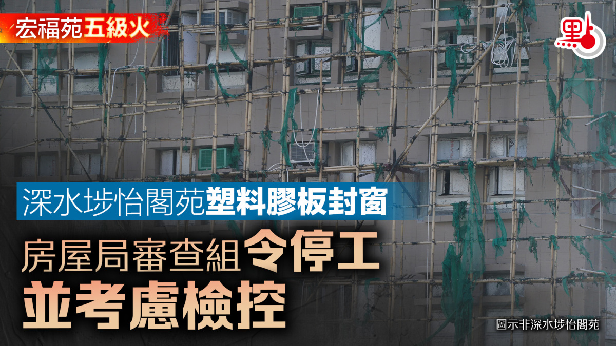 【點新聞報道】房屋局轄下的獨立審查組表示,在特別巡查行動中發現深水埗怡閣苑維修工程使用塑料膠板遮封窗戶,已即時要求項目註冊承建商移除有關塑料膠板,並會諮詢法律意見考慮提出檢控。審查組同時命令該項目暫時停工,並要求承建商進行獨立安全審核、提交改善方案及完成所有改善措施,待審核確認其具備有效安全管理系統後,才會考慮容許恢復工程。