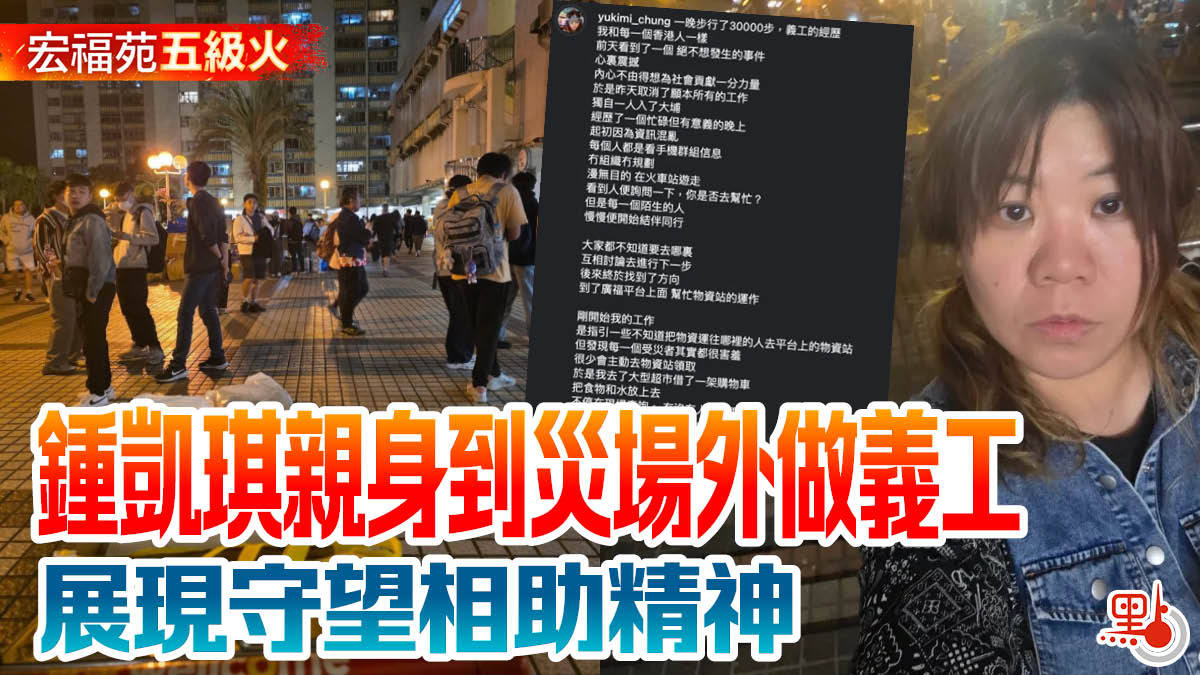 鍾凱琪事後在Ig分享義工經歷,她坦言目睹火災的一刻,內心深受震撼,因而萌生了為社會貢獻一分力量的念頭。為此,她毅然取消了原有工作,獨自一人入了大埔投入義工服務,展現出香港人在危難時刻守望相助的精神:「經歷了一個忙碌但有意義的晚上」。
