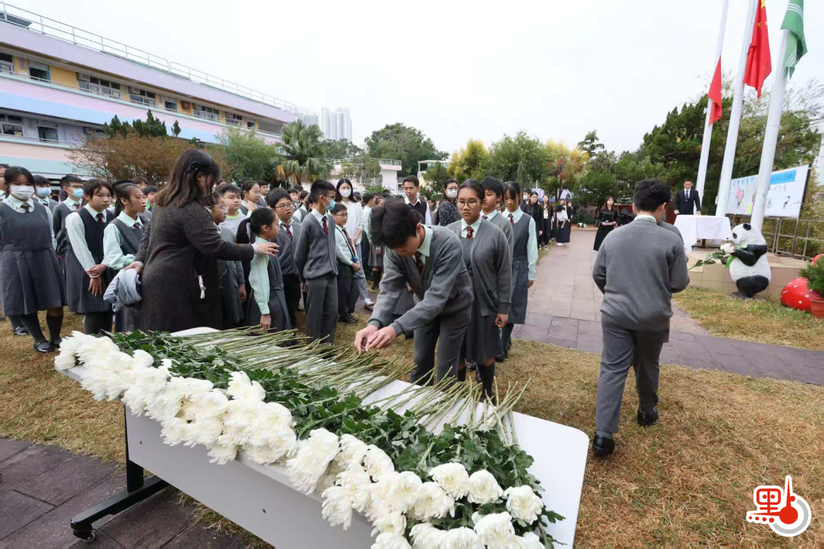 上午7時50分,在該校學生升旗隊的帶領下,全校師生進行下半旗誌哀。其後各班學生代表、校長及教職員逐一上台獻花。該校小六學生兼升旗隊成員李芯穎表示,對大埔火災感到十分悲傷,希望可以向受影響災民送上心意卡,「衷心希望在各方幫助下,他們能夠盡快走出陰霾,重建家園。」芯穎又提到,近日看到大量市民主動捐贈物資,充分體會到香港人守望相助的精神,她又特別向一眾消防和救護人員,致以最崇高敬意。