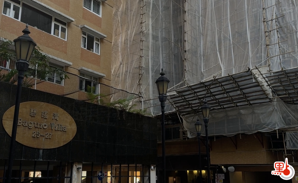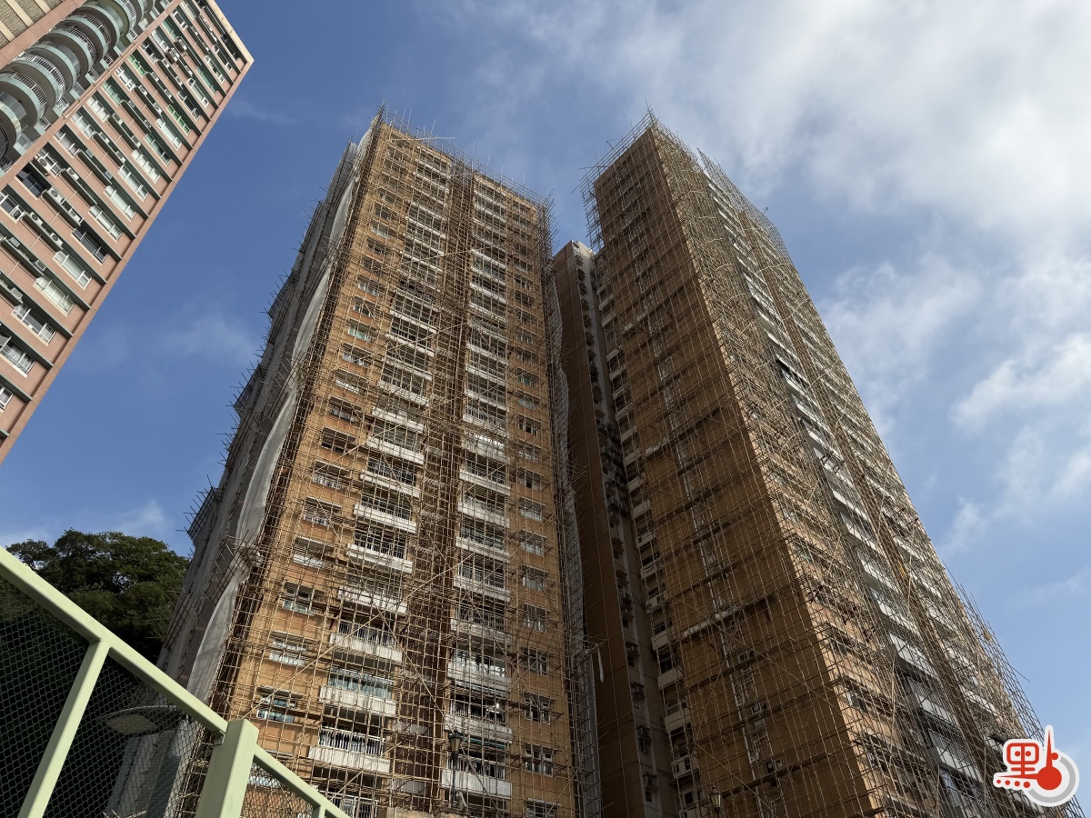 碧瑤灣目前正在進行大維修的包括3座大廈,約300戶單位。點新聞記者上周五在現場看到,3座大廈和宏福苑一樣被竹棚包裹嚴實,且樓棟距離較近。業主林女士指出,早時已有人疑問「點解要圍嗮網,工程又唔係好大,不過冇回音。」