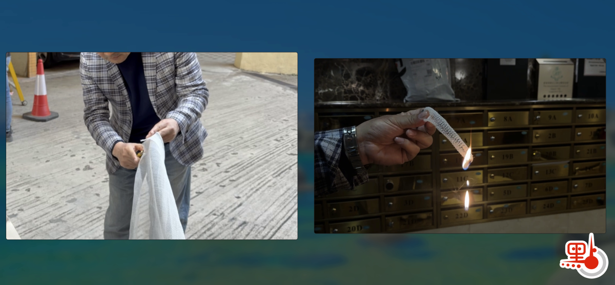 在記者走訪期間,有屋宇署人員到現場取樣抽查,在低層、高層等大廈不同位置取走多塊棚網樣本。有業主從屋宇署人員取樣的棚網剪取部分,現場測試棚網阻燃功效。點新聞記者見到,其中一塊棚網樣未被點燃,但另一塊則遇火即燃,直至燃燒殆盡,不時滴下火星。現場屋宇署人員表示,業主自行剪網點燃並不能作唯一判定標準,物料須經專業檢測後才能定論。