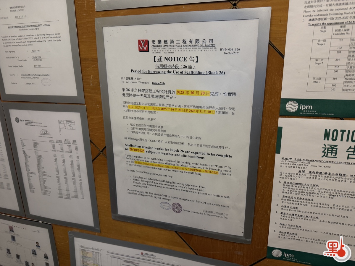 業主劉女士介紹,維修自今年9月起至明年3月,此前出於對業主法團的信任,未曾仔細查看承建商的背景信息,而今次火災牽涉維修工程問題,才警醒許多住戶。業主周女士亦是經他人提醒,才發現維修工程承建商與宏福苑一樣,感到擔心。多人表示,物管公司甚至無定期與未參與法團的住戶匯報進展。