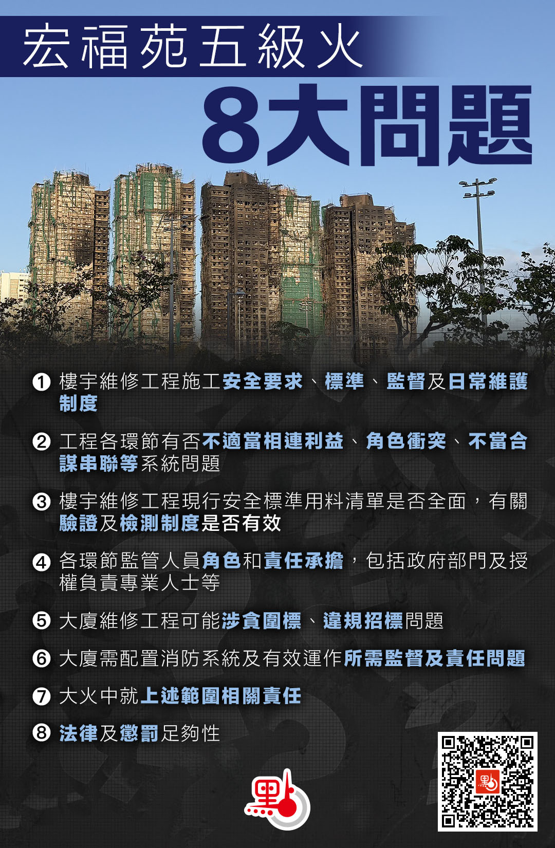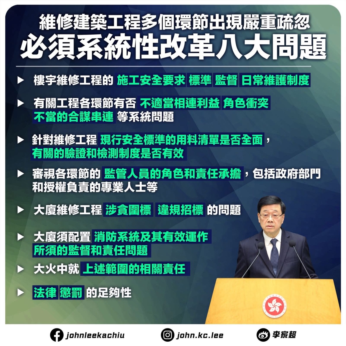 李家超表示,對於本次火災事故,特區政府早前成立3個工作組,強調會調查到底,追責到底。他表示,多個環節出現失誤問題,要系統性改革,包括第一,樓宇維修工程施工安全、日常維護;第二,有否相連利益、合謀串聯;第三,用料清單是否全面、檢測是否有效;第四,各個環節監管人員的角色承擔,包括政府及專業人員;第五,違規招標問題;第六,大廈消防系統運作的監督及責任;第七,大火的相關責任;第八,法律懲罰的足夠性。