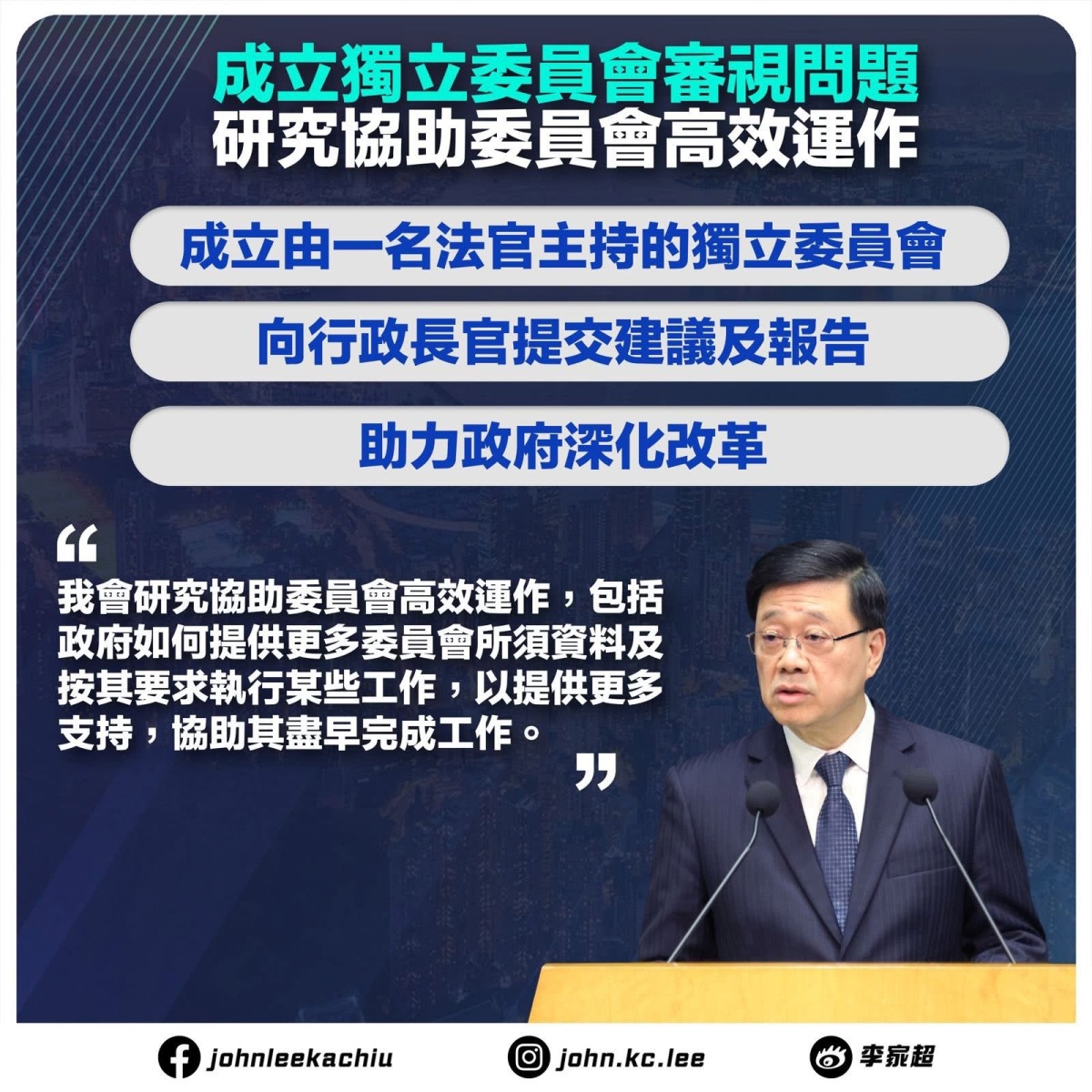 他續指,為防止同類悲劇再次發生,特區政府將針對火災調查成立由一名法官主持的獨立委員會,審視事故起火、火勢迅速蔓延的原因及相關問題,將聯絡司法機構邀請一名法官主持委員會的工作,研究工作範圍,政府將協助委員會盡早完成工作,委員會將向他提出建議和報告,助力政府深化改革。他承諾,獨立委員會的調查報告一定會全面公開。