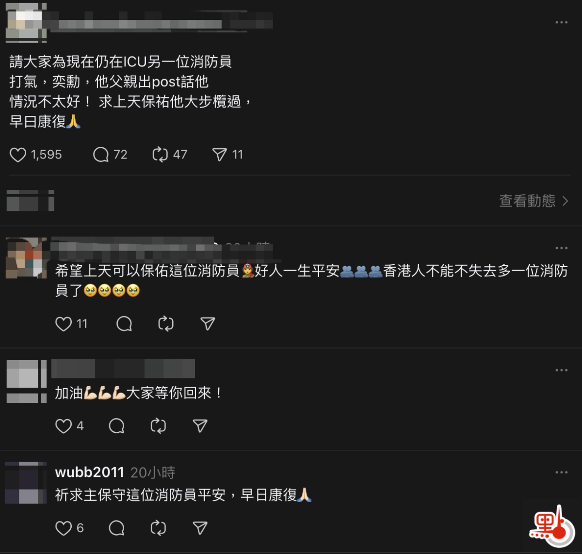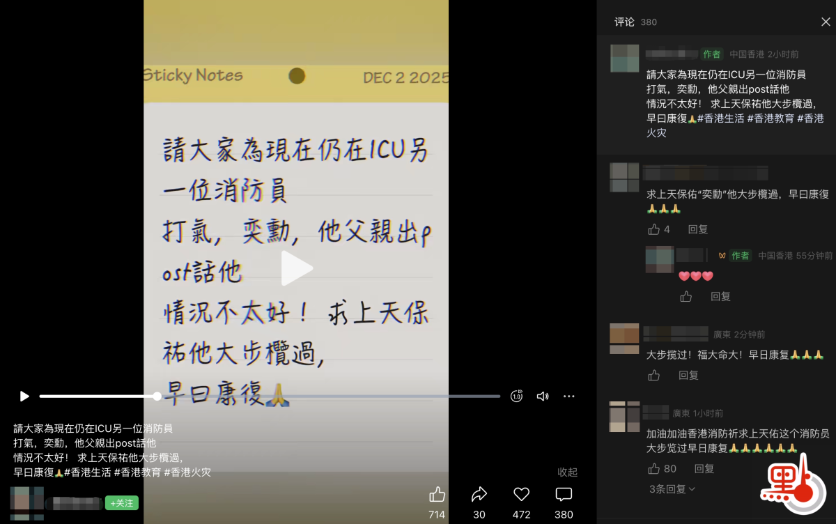 網上帖文指,「請大家為現在仍在ICU另一位消防員打氣,奕勳,他父親出post話他情況不太好!求上天保祐他大步欖過,早日康復。」配以「香港火災」、「宏福苑五級火」等hashtag,暗指該消防員與宏福苑大火有關。該則帖文昨日、今日在FB群組、Threads、Wechat視頻號等社交平台廣為傳播。儘管評論區有網民表示,消防處已公布在宏福苑五級火中受傷的12名消防員已經出院,但相關消息仍被不斷轉發。