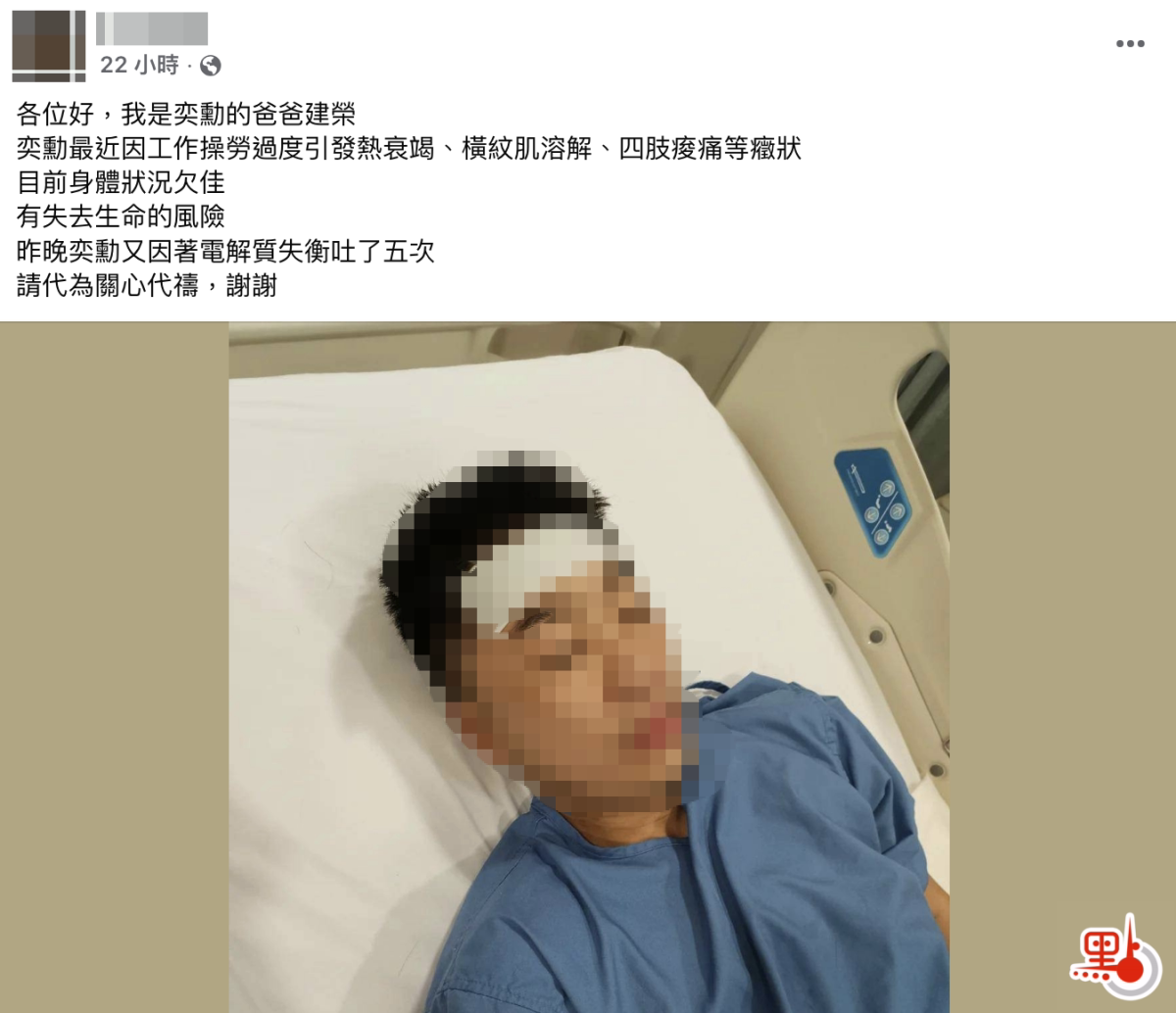 點新聞就此查核,最早發布該帖文的應為一個名為「為你祈福」的FB粉絲專頁,該專頁昨日發布帖文,以「奕勳的爸爸」為名,指「奕勳最近因工作操勞過度引發熱衰竭、橫紋肌溶解、四肢痠痛等癥狀」,「有失去生命的風險」,呼籲網民代為關心祈禱。帖文中,並未提及「奕勳」身份,也沒有提及「香港」、「消防員」、「宏福苑」。