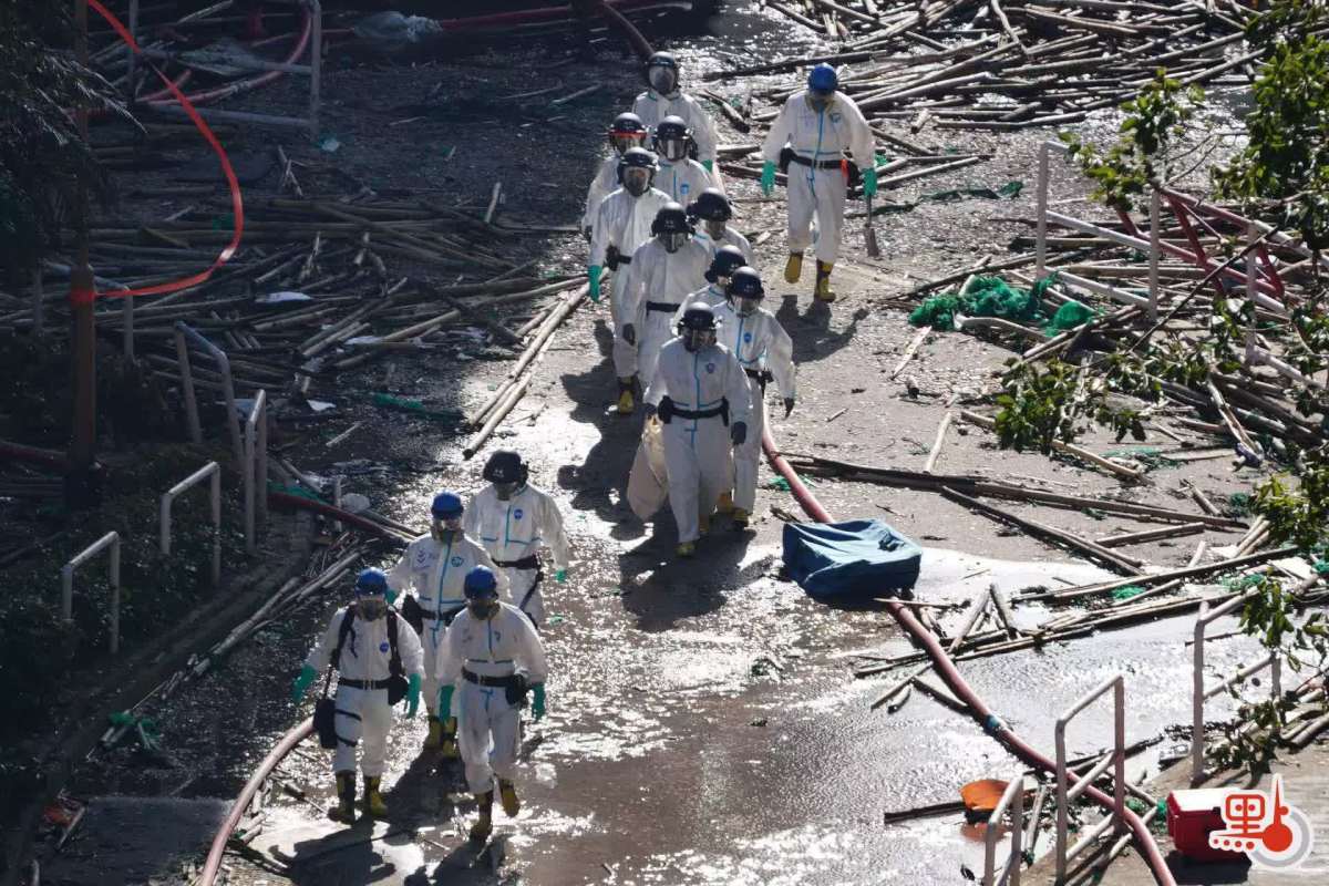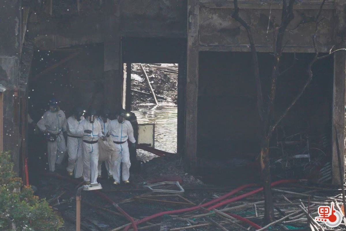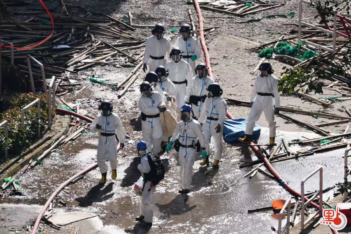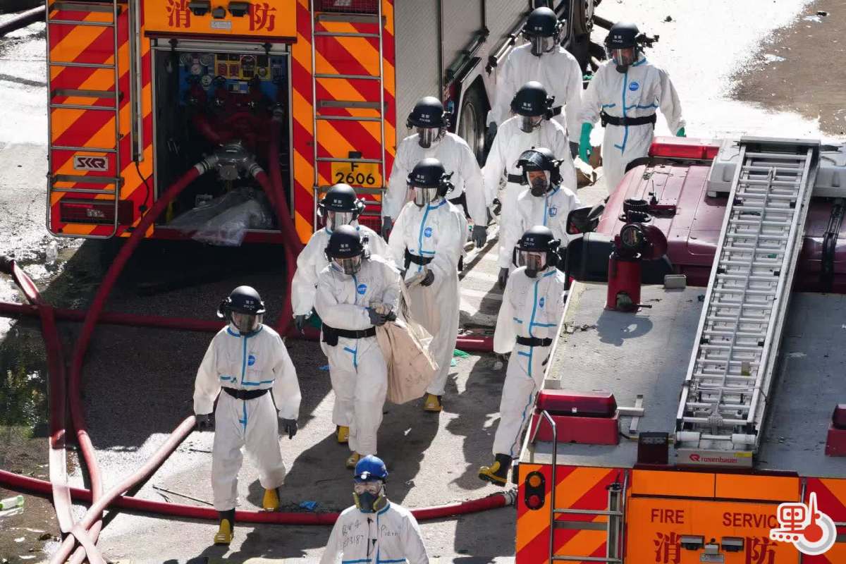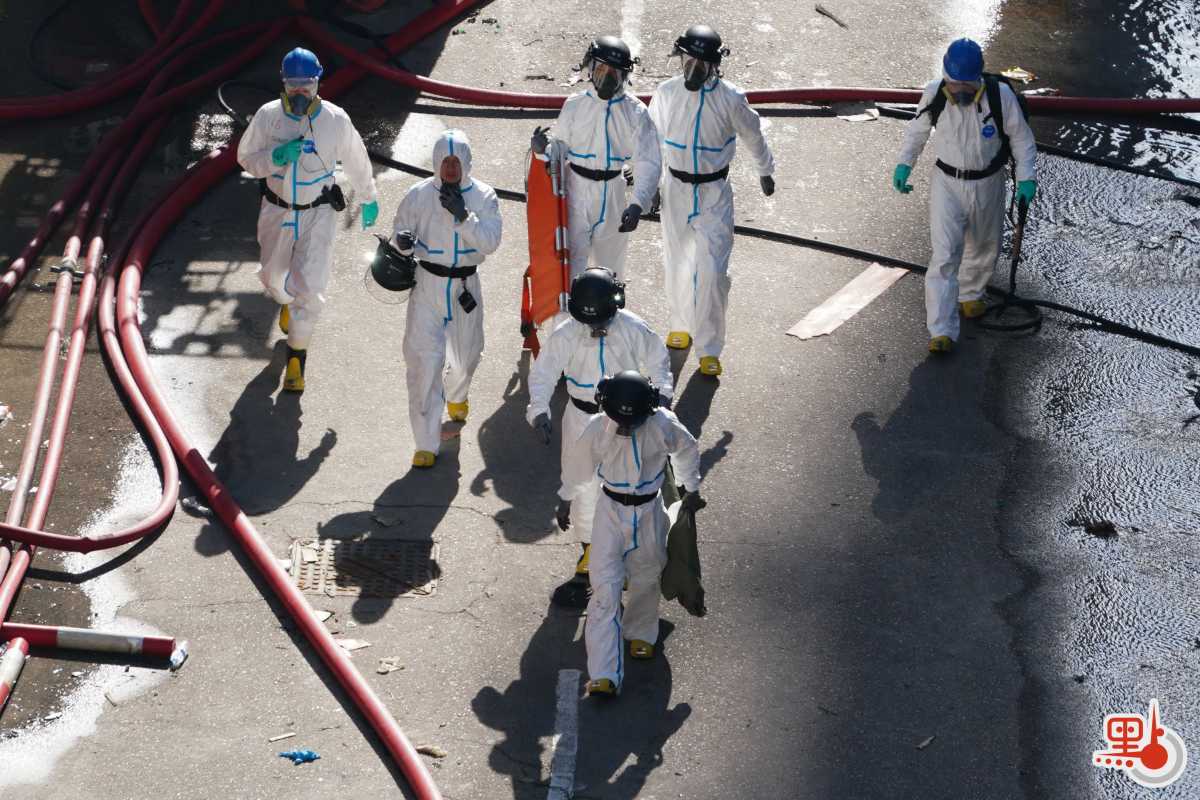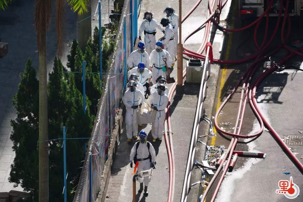 連日來,大批DVIU人員身穿全套白色保護衣、防滑靴,戴上寫有「DVIU」字樣的藍色頭盔及孭有一個黑色腰包,在火場外圍集合後,列隊有序進入火場封鎖區域。其間,人員仔細勘察火場情況及周圍環境,搜索是否有人體遺骸。