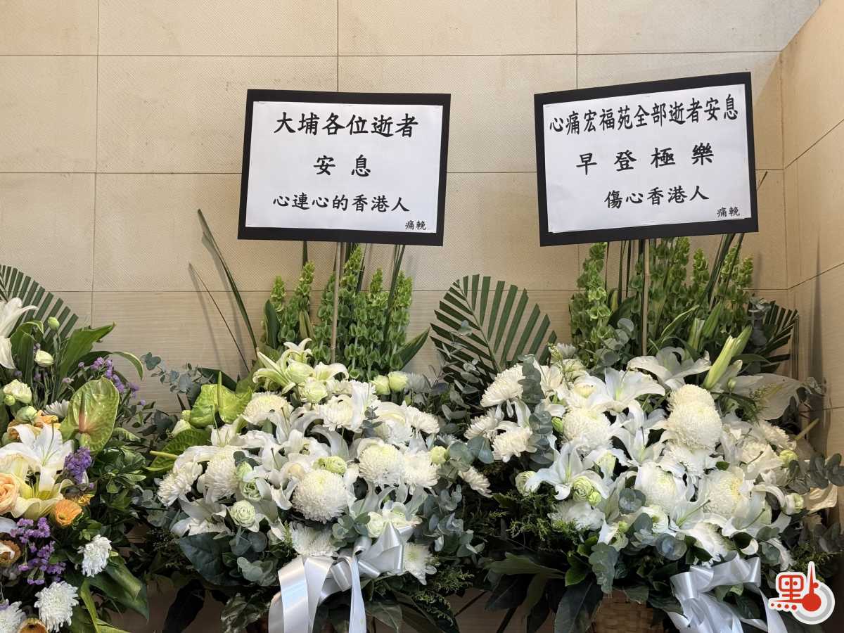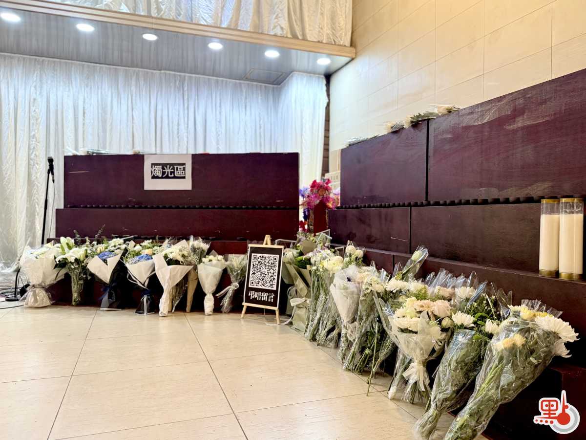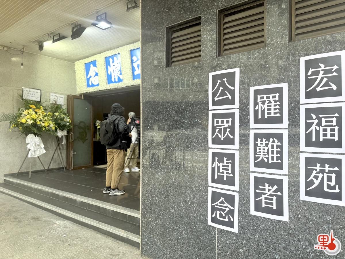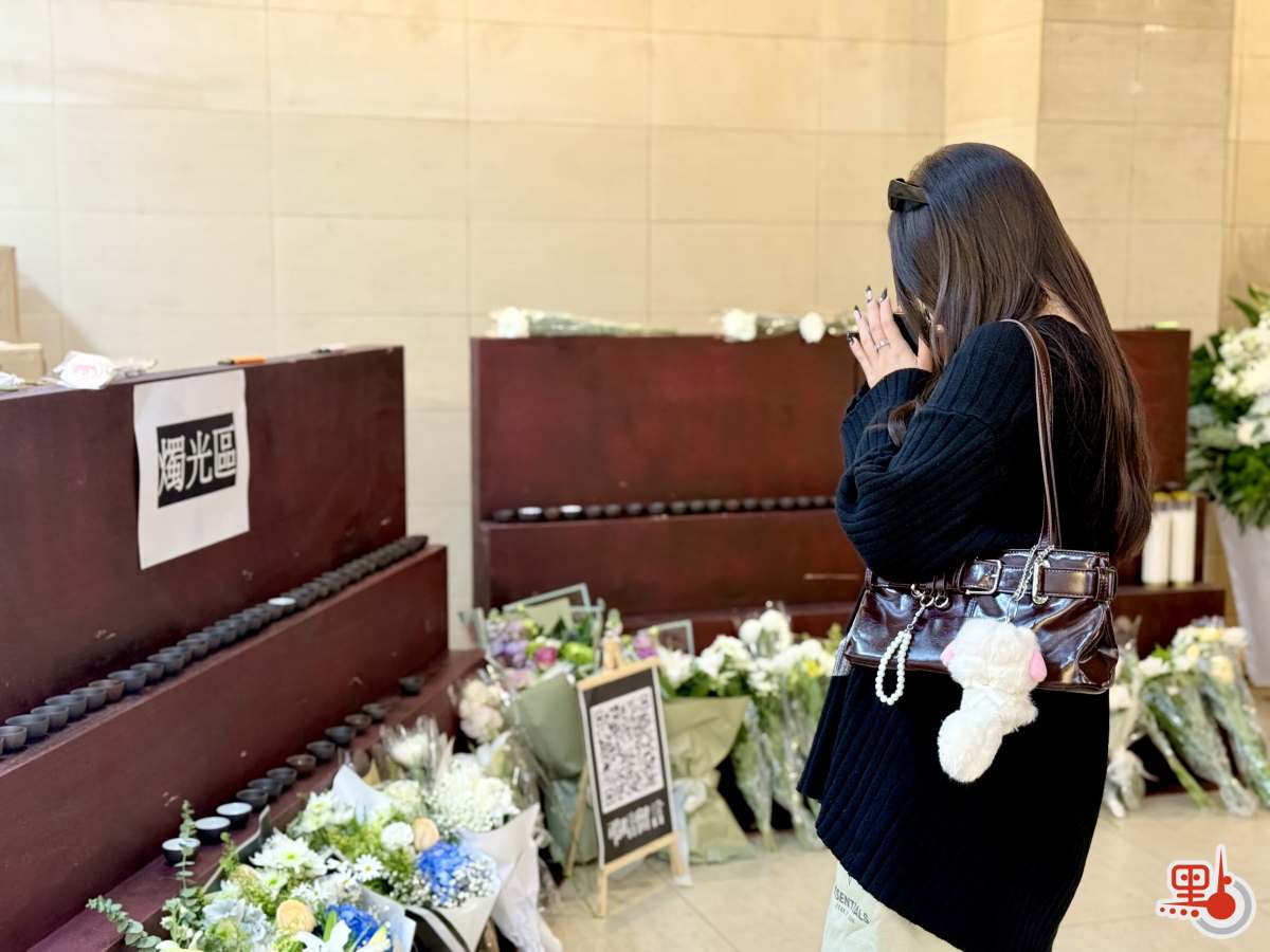 點新聞記者今日上午10時許到場,見九龍殯儀館內外已有多束市民帶來的鮮花,附有「大埔宏福苑火災眾遇難者往生淨土」等弔唁留言,氛圍安靜肅穆。殯儀館內設有鮮花台、祭品台,亦設有弔唁留言及為災民捐款的二維碼,此外還有燭光區供市民點燃蠟燭並默哀,悼念亡者。眾多市民默哀之餘亦自發折疊蓮花、元寶等祭祀用品,以祭奠遇難者。