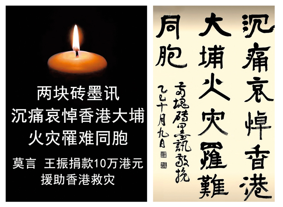 【點新聞報道】大埔宏福苑11月26日下午發生五級大火,造成嚴重人員傷亡。火災發生以來,香港各界、內地企業、名人、機構積極伸出援手,或捐款、或捐物,合力協助香港救災善後。著名作家莫言、書法家王振日前通過二人聯合創辦的公眾號「兩塊磚墨訊」發出訊息:「沉痛哀悼香港大埔火災罹難同胞,莫言、王振捐款10萬港元,援助香港救災」,表達對受災同胞的深切關懷。