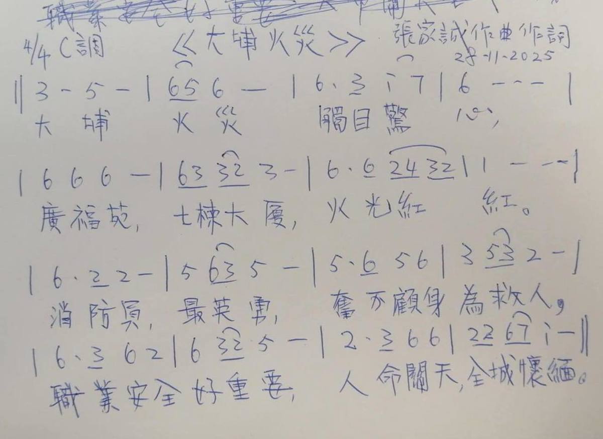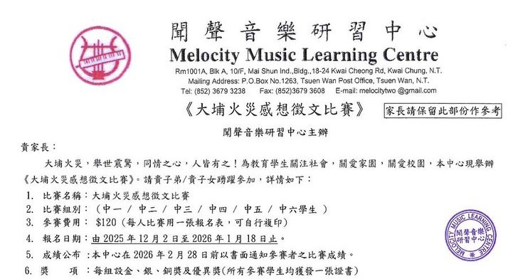 涉事「聞聲音樂研習中心」的比賽單張顯示,「大埔火災,舉世震驚,同情之心,人皆有之!為教育學生關注社會,關愛家園,關愛校園,本中心現舉辦《大埔火災感想徵文比賽》。」比賽面對中一至中六學生,報名日期由即日起至2026年1月18日,並設有120元參賽費。