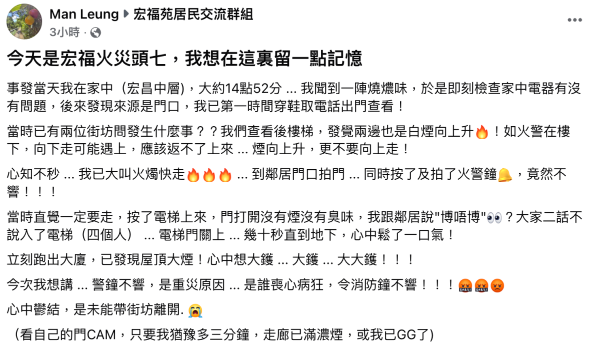 該名自稱住在宏昌閣中層的居民表示,事發當時下午約2時52分,在家中聞到燒焦味道,後發現氣味來自門口,隨後他與兩名街坊查看後樓梯,發現兩邊均有白煙向上升,意識到火警恐來自樓下,向下逃生可能會遇到危險,而煙霧向上蔓延亦不宜向上走,他隨即大叫「火燭快走」,並拍鄰居門示警,同時按下火警鐘,卻發現火警鐘沒有聲響。隨後,他按下電梯,發現電梯內沒有煙味,隨即與3名鄰居「搏一搏」衝入電梯,幾十秒後眾人安全到達地面,他跑出大廈,已經發現大廈屋頂有很大煙。該居民怒斥,「今次我想講...警鐘不響,是重災原因...是誰喪心病狂,令消防鐘不響!!!」
