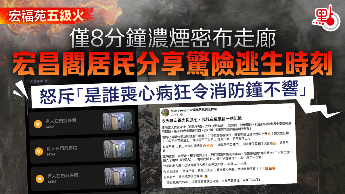 【點新聞報道】大埔宏福苑11月26日五級火造成嚴重傷亡,消防處經過調查指出,大火期間宏福苑8座大廈的火警鐘全部失效,沒有發出聲響。有自稱住在宏福苑宏昌閣中層的居民在Fb群組「宏福苑居民交流群組」分享火警時大門閉路電視片段紀錄,顯示事發8分鐘內,門口走廊便已經被濃煙充斥,怒斥「是誰喪心病狂,令消防鐘不響!!!」