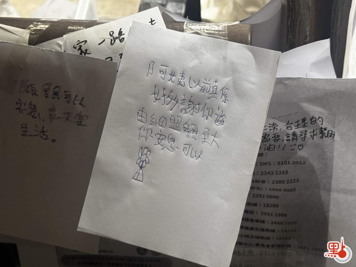 點新聞記者在現場遇到一位劉先生。他手持鮮花,面朝宏福苑的方向雙手合十、多次鞠躬,口中念「希望你安息」等話語。隨後,劉先生拿起筆寫下一張卡片:「阿姨(姨媽),多謝你對我由細照顧至大。」寫完後,他一時失神,不知該將卡片擺放在何處。記者幫他接過卡片,並按其意願,小心翼翼地粘貼到一個他認為穩妥的位置,「我希望阿姨睇得到」。