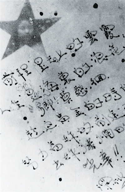 我們在血海中新生/我們在血海中邁進/今天/勝利正展現在我們的眼前/我們要準備着更大的流血/去爭取前途的光明