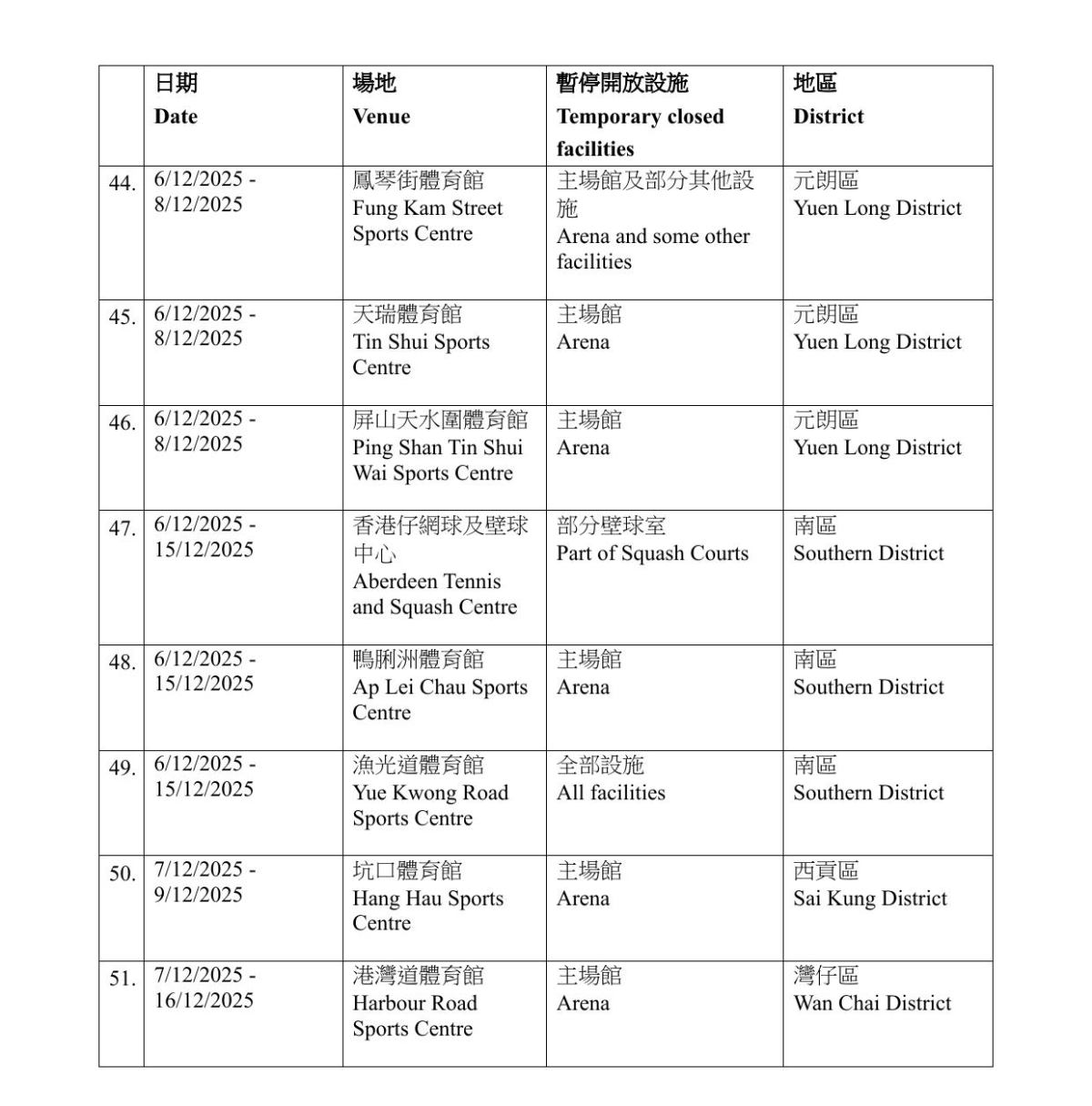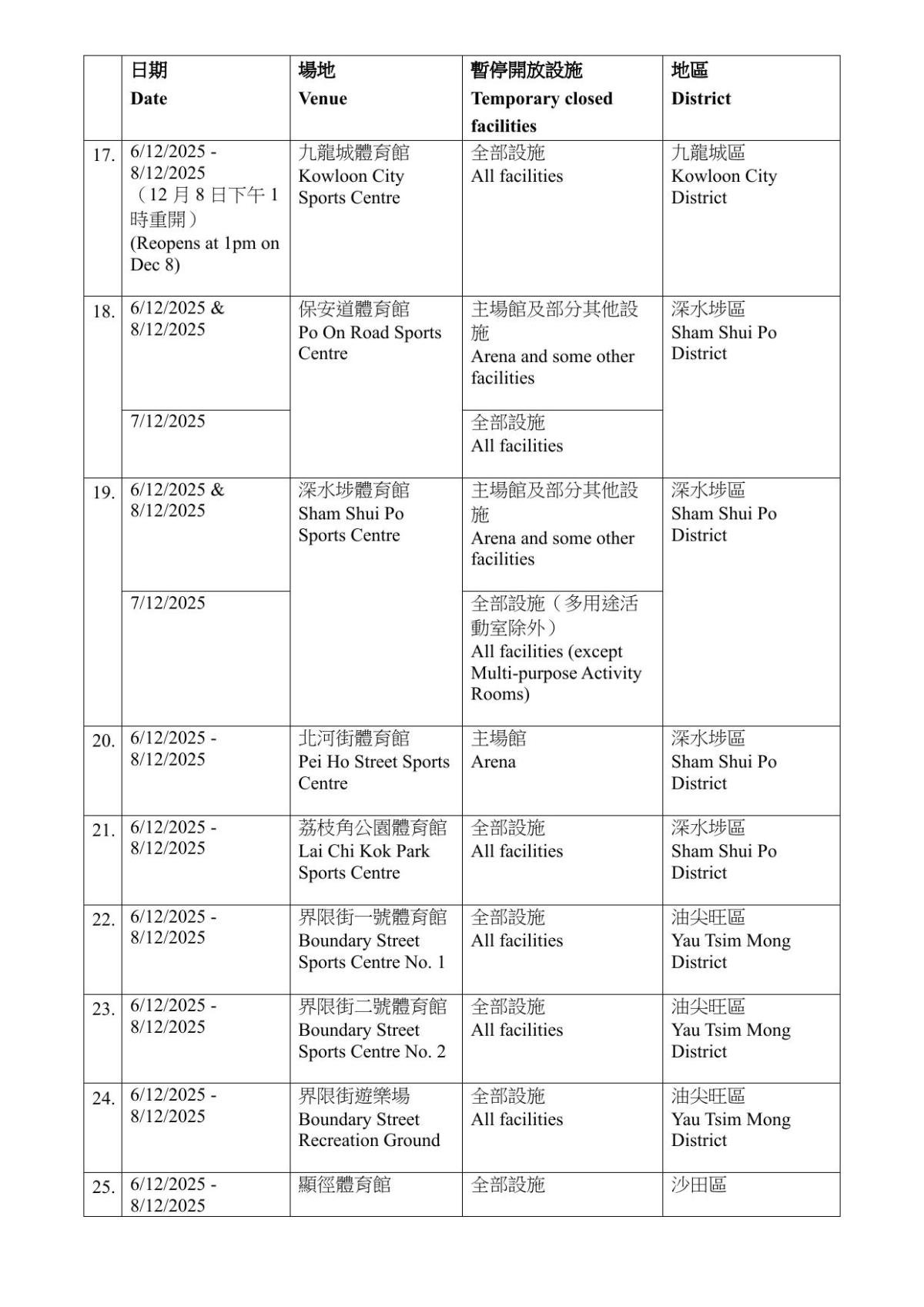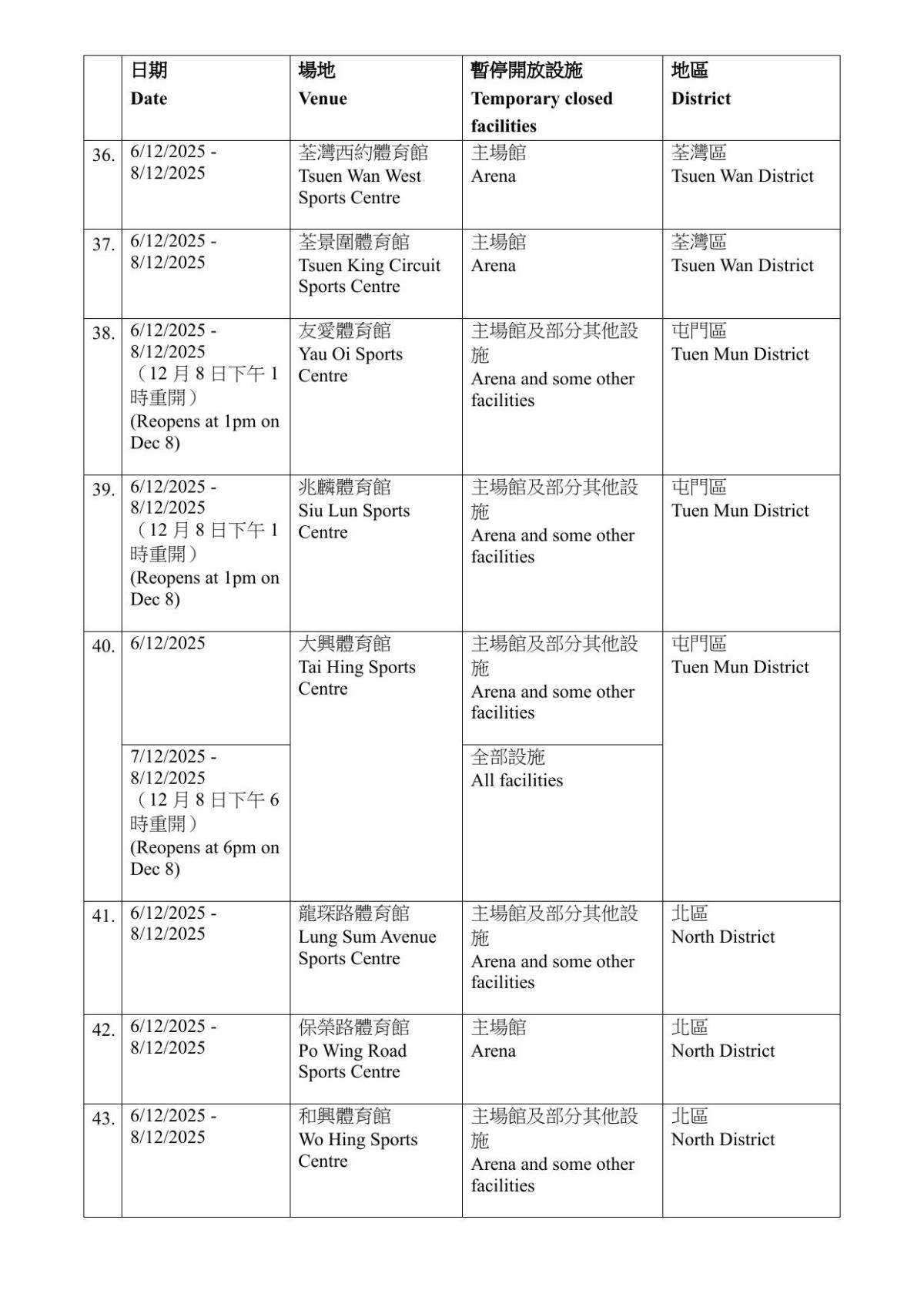 康文署指,有關設施暫停開放期間,市民可使用區內其他同類康樂設施。暫停開放日期如因應實際情況需予以調整,會另作公布。而根據康文署資料,大部分設施會在12月6日至8日期間暫時關閉,亦有設施關閉至15至16日。需要暫停開放的設施遍布全港17區,而葵青區則沒有設施受影響。