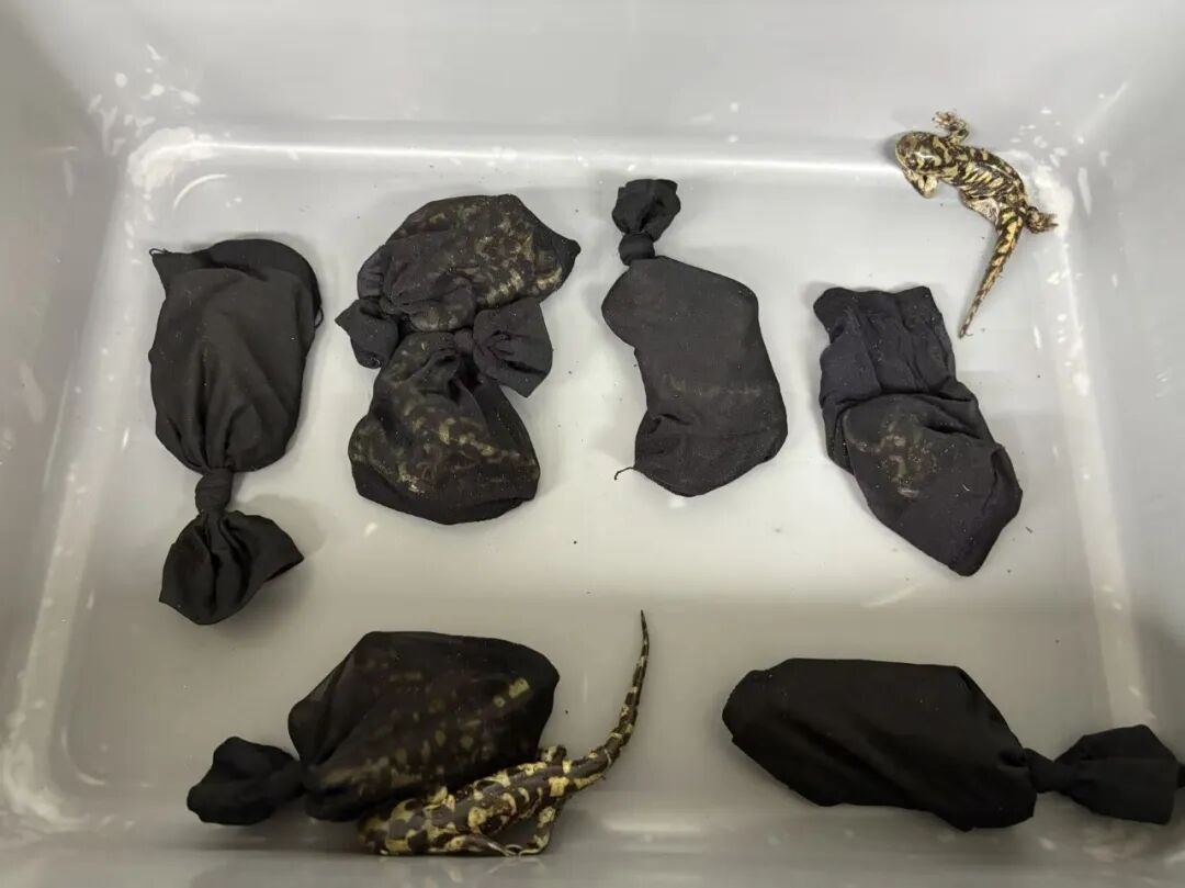 羅湖海關關員在對進境旅客進行監管時,發現3名女性旅客、1名男性旅客進入海關監管區未向海關申報,4人均行色匆匆,有意從遠離查驗崗位的一側快速通過,海關關員立即對4人進行攔截檢查。經進一步檢查,海關關員分別在男性旅客的腰腹部、上衣口袋香煙盒及行李中,查獲用特製黑襪包裹的疑似活體螈科動物18隻;在其中一名女性的口袋、腰腹部及行李中,查獲同類動物21隻;在另外兩名女性的行李中,查獲同類動物33隻,共計查獲疑似活體螈科動物72隻。