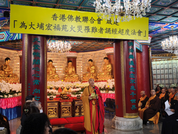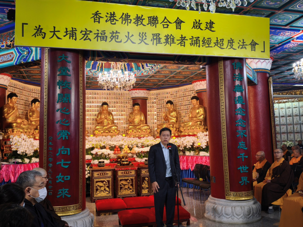 法會正式開始前,寬運法師致辭表示,香港佛教界本着「無緣大慈,同體大悲」的精神,在災難發生後即時行動起來,上周五,香港佛教聯合會為火災事故啟建「息災祈福冥陽兩利法會」,同時呼籲全港佛教道場及佛教徒,透過誦經、念佛、超度、祈願的方式,為往生者超度,為受災者加持,祈願傷者早日康復,失聯者平安與家人團聚,劫後餘生者早日撫平創傷,重獲新生。災難發生後,全港佛教道場迅速同心響應,紛紛為罹難者舉辦超度法事。香港佛教聯合會一連數日在社交媒體上整合全港佛教道場為火災舉辦的法會消息,讓善信能第一時間獲得相關資訊。為方便市民參加,香港佛教界在12月2日於多個地點為罹難者舉辦「頭七」超度等相關法事。