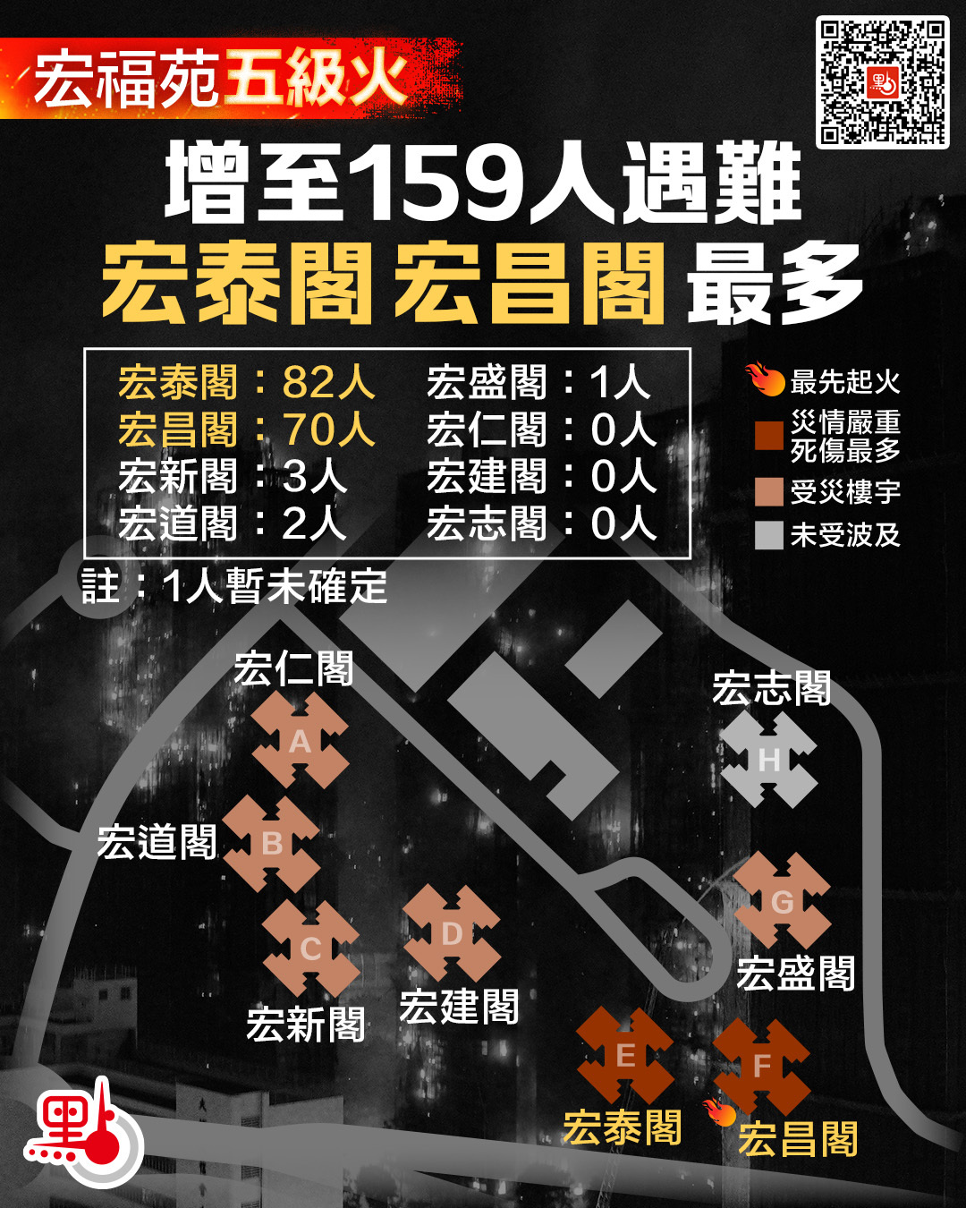對於遇難者所處樓宇分布,其中宏泰閣和宏昌閣遇難者人數目前最多,宏泰閣有82人遇難,宏昌閣有70人遇難;宏新閣有3人,宏道閣有2人,宏盛閣有1人;宏仁閣、宏建閣、宏志閣未發現遇難者;還有一人未確定在哪座大廈出事,但估計在宏昌閣或宏泰閣,警方會繼續跟進。