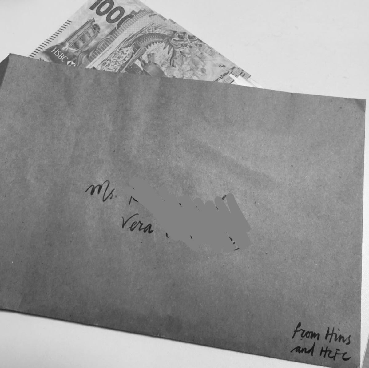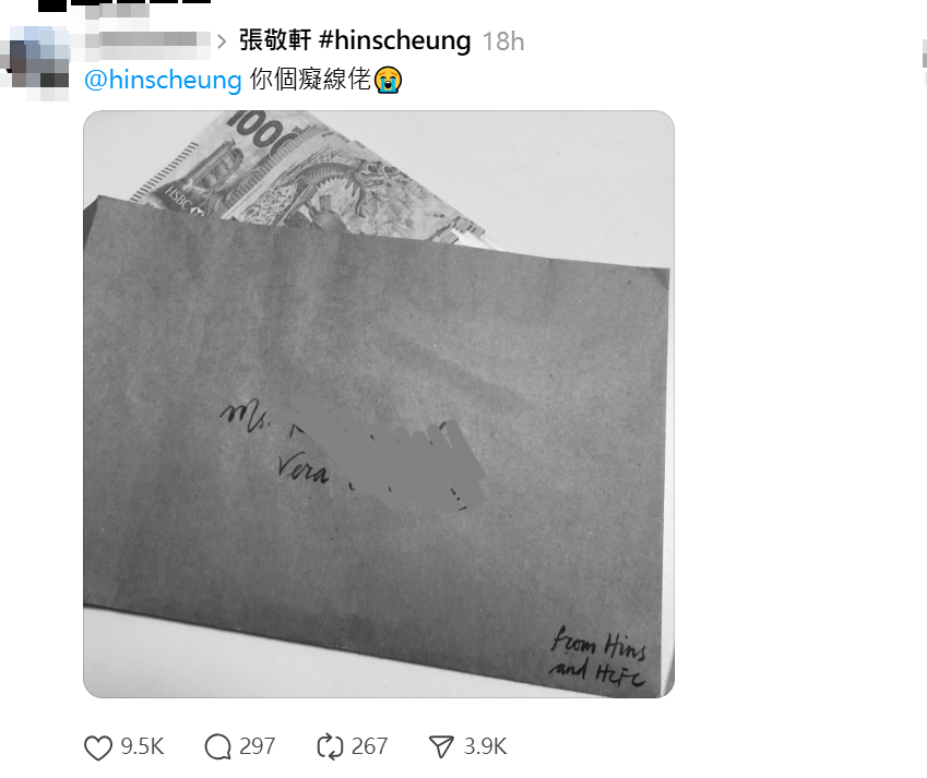 近日,有登記地址位於宏福苑的軒仔歌迷會會員,陸續獲得歌迷會工作人員主動聯絡及慰問。昨晚(2日)便有受災粉絲在社交平台上載照片,展示由軒仔及歌迷會寄出的信件,信封內可見多疊1000元紙幣,該粉絲留言「@hinscheung 你個黐線佬」引起網民熱烈討論,有人估算至少有5疊1000元紙幣,估計有5萬元;亦有網民放大照片並數到約7至8疊1000元紙幣,猜測金額或達10萬元。