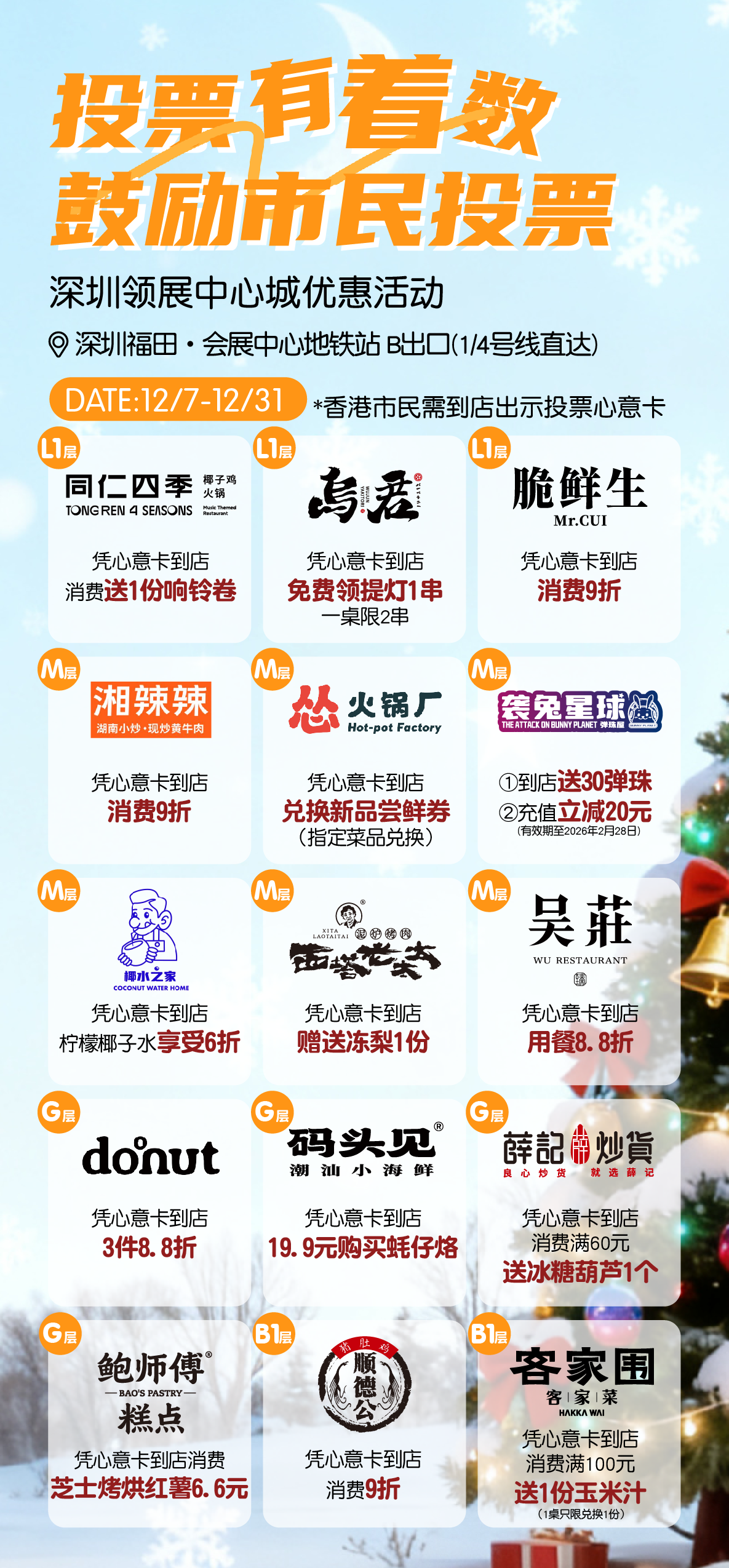 2025年12月7日起至12月31日,香港市民只需到店出示投票憑證心意謝卡,便可在領展中心城的脆鮮生·脆皖魚火鍋、湘辣辣·鮮炒黃牛肉、吳莊、doOnut、順德公豬肚雞·煲仔飯等店享受消費8.8折至9折優惠,同仁四季椰子雞、烏君·炭火燒鳥、慫火鍋、西塔老太太·泥爐烤肉、客家圍·客家菜等店可贈送禮品,還有港人喜愛的鮑師傅、薛記炒貨、椰水之家等小吃、飲品店均參與活動。