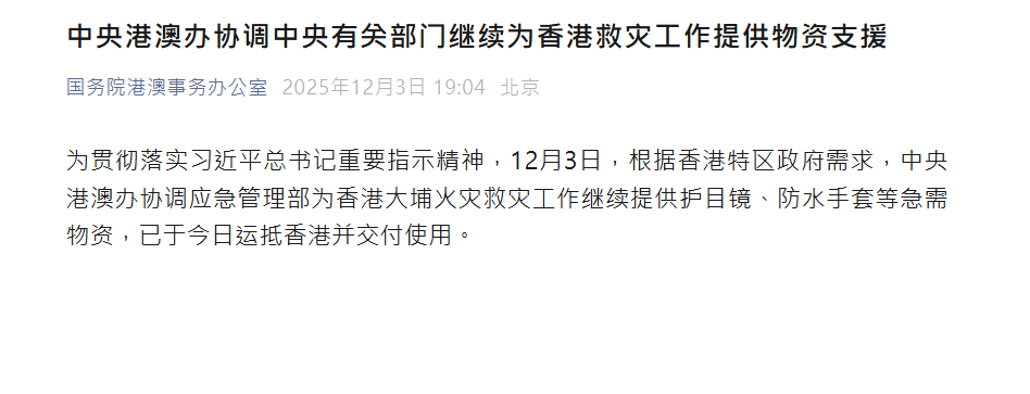 【點新聞報道】為貫徹落實習近平總書記重要指示精神,12月3日,根據香港特區政府需求,中央港澳辦協調應急管理部為香港大埔火災救災工作繼續提供護目鏡、防水手套等急需物資,已於今日運抵香港並交付使用。