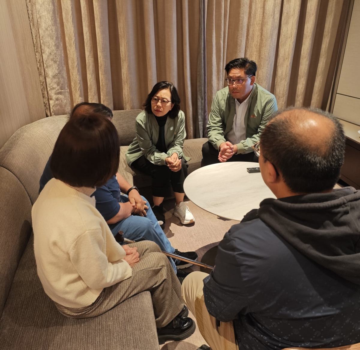 【點新聞報道】宏福苑11月26日發生五級大火,造成嚴重人員傷亡。民青局局長麥美娟今日(12月3日)在社交平台發文表示,她今晚與民青局副局長梁宏正來到沙田帝逸酒店,探望暫時安置於此的薛先生一家。他們所住的大廈受到大火波及,所幸是一家三口平安,已在酒店暫住,物資也都充足。他們也感謝政府與社會各界的暖心支持,並表示已經有「一戶一社工」與他們聯繫。