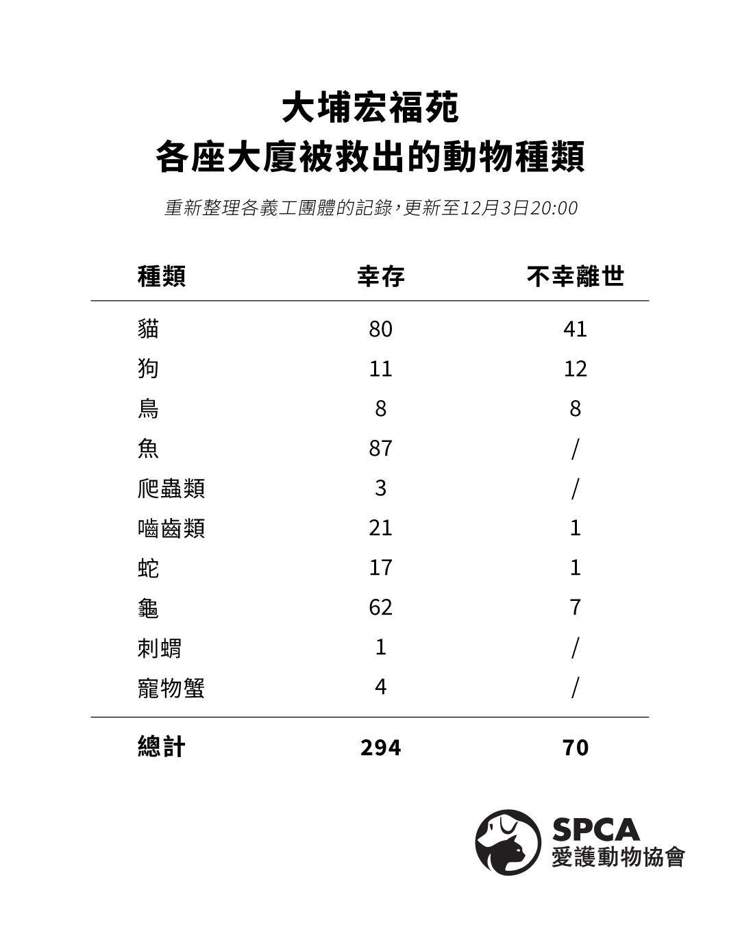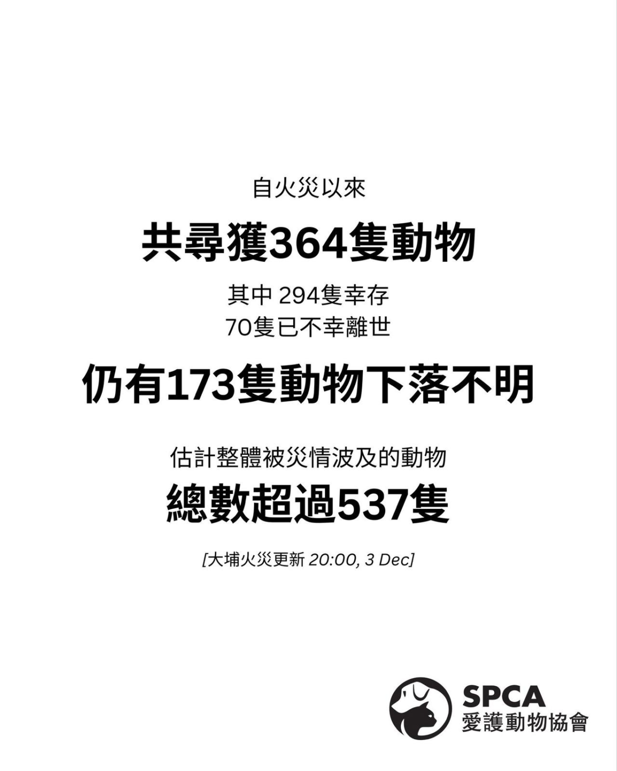 【點新聞報道】宏福苑11月26日發生五級大火。愛護動物協會(愛協)表示,截至12月3日晚上8時,自火災以來消防員共尋獲364隻動物,其中294隻倖存,70隻已不幸離世,仍有173隻動物下落不明。愛協估計整體受影響的動物總數超過537隻。