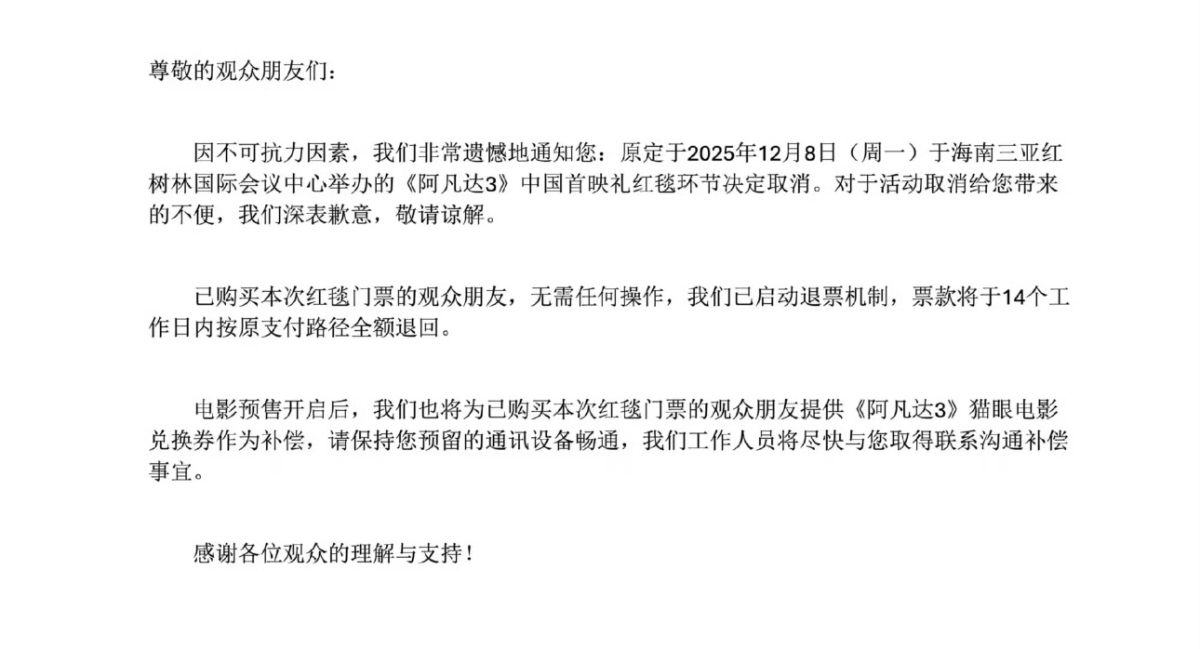 據悉,在三亞舉辦的紅毯首映環節有售票,導演占士金馬倫亦將出席。近日有購票網民突然收到紅毯活動取消的郵件通知,內容稱「我們非常遺憾地通知您:原定於2025年12月8日(周一)於海南三亞紅樹林國際會議中心舉辦的《阿凡達3》中國首映禮紅毯環節決定取消。對於活動取消給您帶來的不便,我們深表歉意,敬請諒解。」