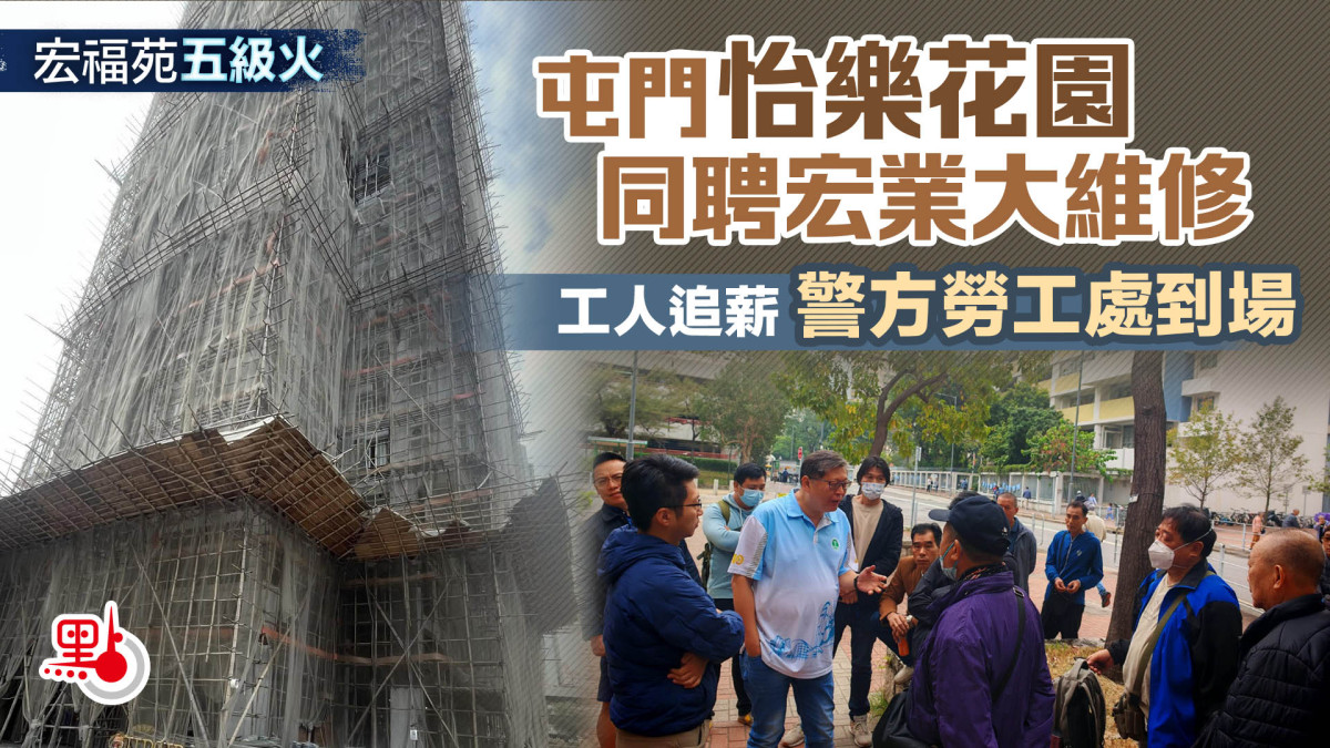 【點新聞報道】屯門怡樂花園與大埔宏福苑大維修承辦商同為宏業建築工程,怡樂花園管理處在宏福苑火警發生後翌日(11月27日)發出通告,指遠東顧問工程公司就屋苑工程安全要求停止大維修工程。今日(12月4日)早上10時,約20名屬二判永順香港工程有限公司的工人在大廈外牆掛橫額追薪,指約80名工人已被欠薪4個月。