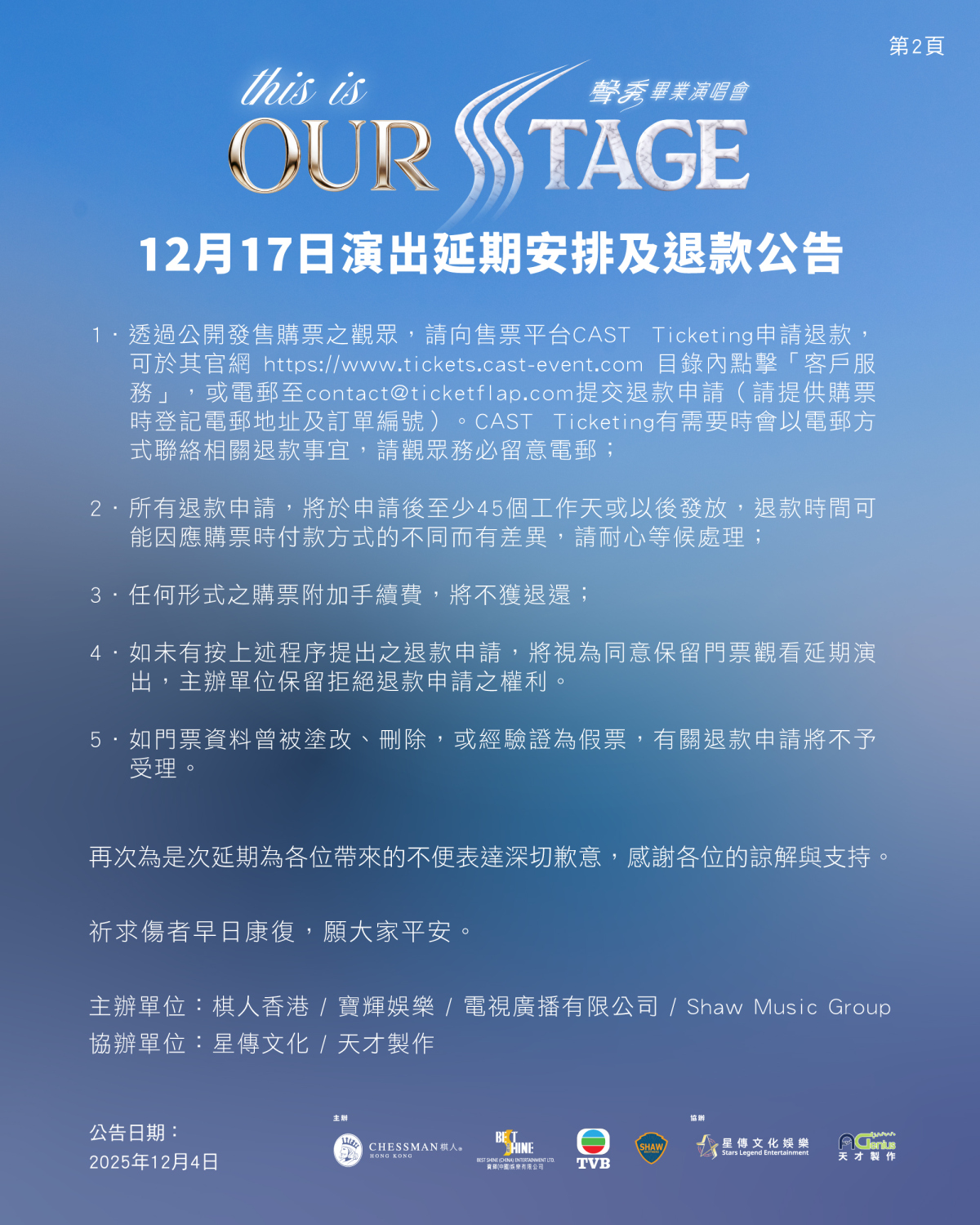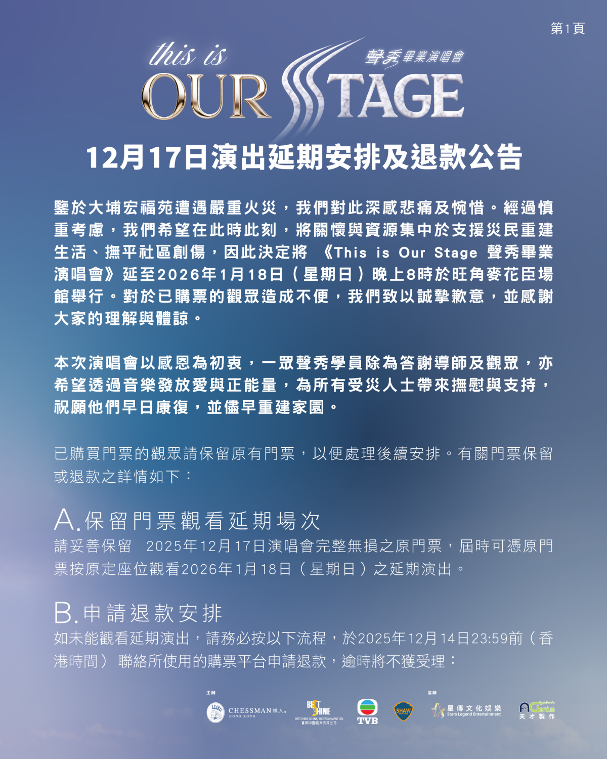 【點新聞報道】《This is Our Stage聲秀畢業演唱會》原定12月17日在旺角麥花臣場館舉行,由於大埔宏福苑11月26日發生五級大火,主辦方決定延期舉行,冀將關懷與資源集中於支援災民。以下為公告全文: