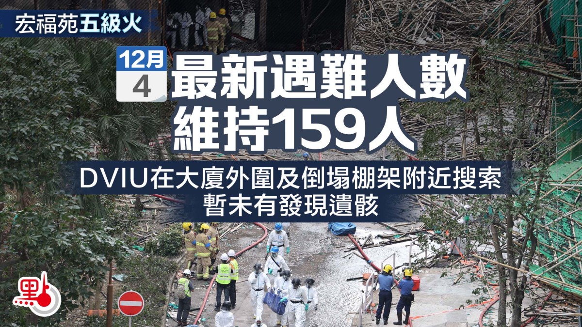 【點新聞報道】大埔宏福苑11月26日發生奪命的五級大火,釀成過百人遇難,數千人失去家園。政府今(4日)晚公布跟進大埔火災最新情況,警方已完成所有7幢大廈內部範圍的搜索工作。今日約300名「災難遇害者辨認組」(DVIU)人員在已確定安全的大廈外圍及倒塌棚架附近進行搜索,暫未有發現遺骸,死者數目維持159人。