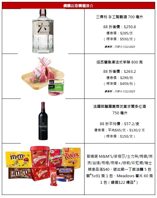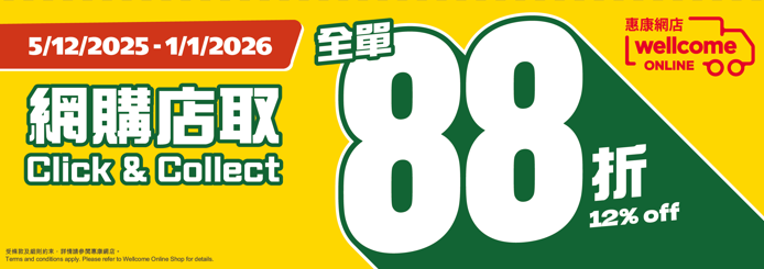惠康及Market Place網店於2025年12月5日至2026年1月1日推出獨家優惠,選用網購店取購物即享全單88折(網購店取訂單最低消費額為$50,以單一交易及折實價計算。)!顧客只需於指定頁面領取電子優惠券即可享有優惠,讓你以更筍價格挑選產品。