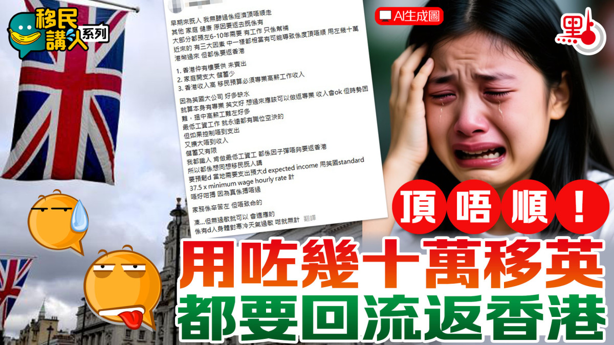 【點新聞報道】都話無錢移民,寸步難行。有移英港人在網上發文,分析指有三大因素,導致移英人士頂唔順,用咗幾十萬港幣過來,但都要回流返香港。其實都離不開不個錢字,奉勸要準備充足銀彈,「唔好咁搏,因為真係搏唔過」。