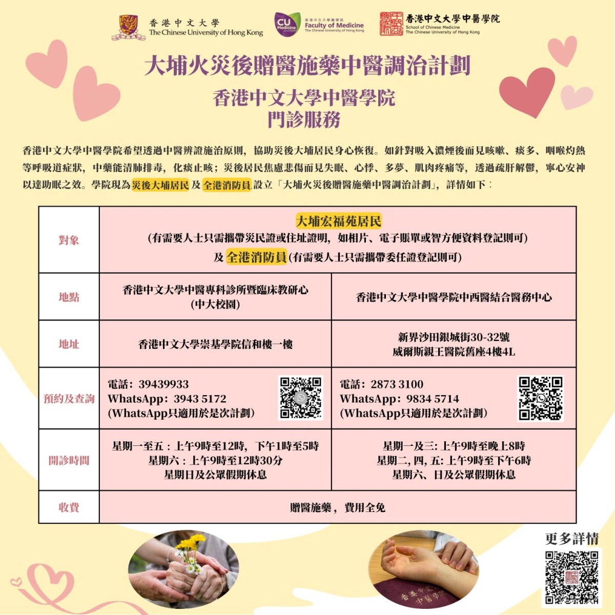 有需要的大埔宏福苑居民及全港消防員,即日起可攜同身份證明文件,經電話或WhatsApp預約就診。學院將為受影響的居民及消防員提供全科(方脈)診症連內服中藥,次數及劑量不限,費用全免。經診症後倘有需要亦會提供免費針灸及推拿等服務。