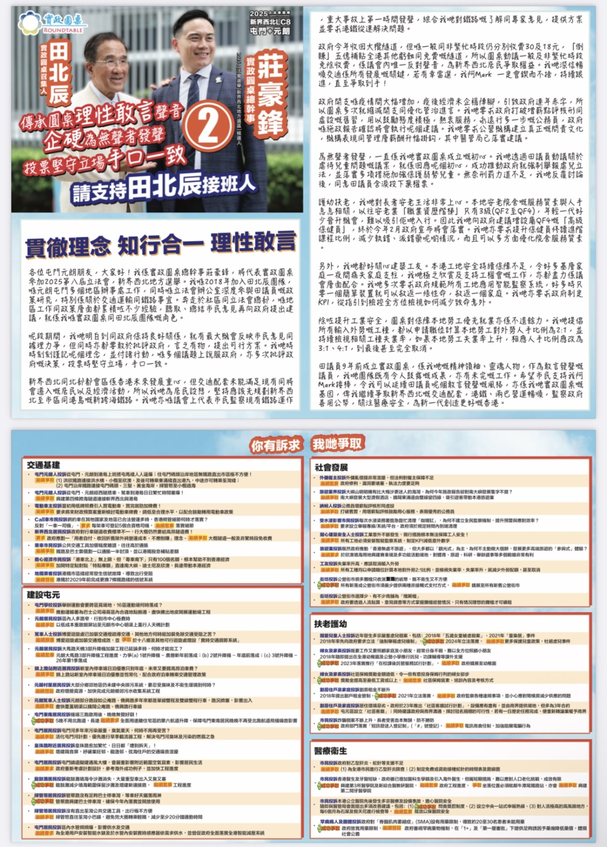 2號候選人為實政圓桌田北辰「接班人」莊豪鋒。交通方面,他堅持應先規劃新界西北至市區和港島的新跨海鐵路,例如,政府今年收回大欖隧道,但收費仍高昂,故提出一般及非繁忙時段免除收費,為當區居民爭取權益。經濟方面,他爭取加開「粵車南下」特定點對點「特許專額」直達南大嶼、迪士尼及欣澳,帶動本港經濟;提倡南大嶼沙灘和海岸打造高級假日休閒酒店區,創造可觀經濟效益,並與迪士尼產生協同效應。就青年發展,莊豪鋒建議民青局牽頭,鼓勵商場業主以提供稅務優惠為誘因,撥出部分高人流商場的小舖,低價租予首次創業的年青人,政府於三年內須提供短期免費的人事、財務及現金流管理、法律、商標專利等專業支援,作為微企商業模式的實習期。